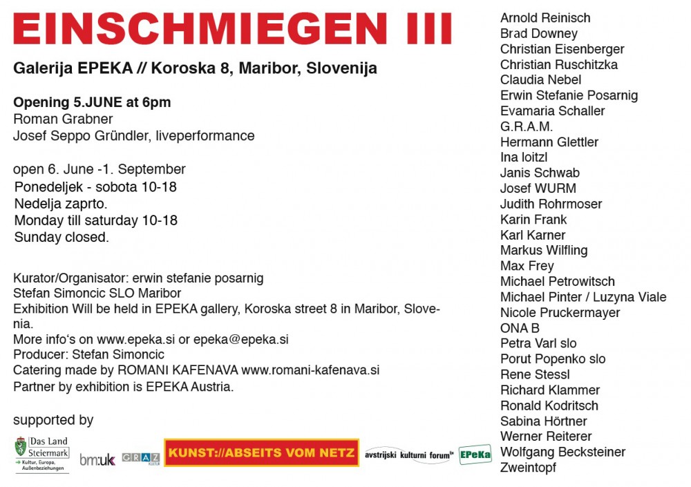 ONA B, Evamaria Schaller, Nicole Pruckermayer, Brad Downey, Max Frey, Rene Stessl, Sabina Hörtner, Porut Popenko, Herrmann Glettler, Janis Schwab, Becksteiner Wolfgang, Petra Varl, Christian Ruschitzka, Richard Klammer, Christian Eisenberger, Karin Frank, Ronald Kodritsch, Ina loitzl, Claudia Nebel, Michael Petrowitsch, Michael Pinter / Luzyna Viale, Erwin Stefanie Posarnig, Arnold Reinisch, Werner Reiterer, Judith Rohrmoser, Markus Wilfling, Josef WURM, Zweintopf, Karl Karner, G.R.A.M.
