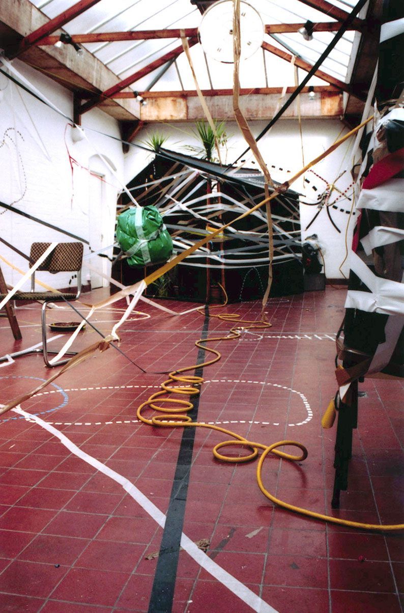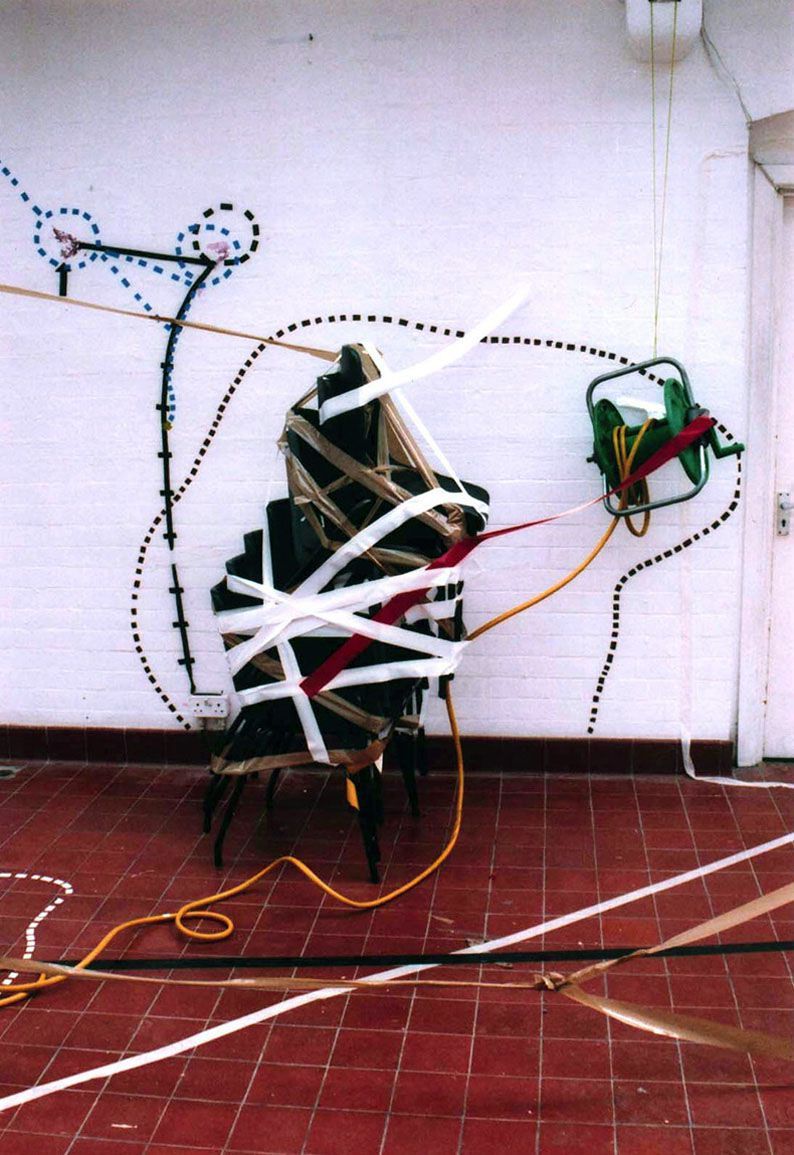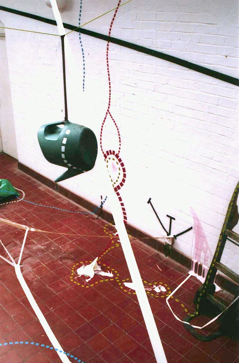 We were invited to create an exhibition for a gallery space near Hammersmith Station in London. The Gallery needed the exhibition to be completed in just a few days. We were offered no budget or materials, but were granted full access to everything in or around the gallery. We used everything; all items from the office and garden to include: water hose with spool, tool shed, roll of plastic, wheel barrow, roll of paper, step ladder, extendable ladder, bench, green trash bags, hand saws, push brooms, duct tape in three colors, packing tape, electrical tape in various colors, wooden box, rakes, stackable chairs, desk chair, plate, palm trees, twine, watering can, pink paint, hand truck, cactus, pine tree, fishing wire, pick axe, circular table, shovel, hammer, and a big plastic suitcase. After the opening party we packed as much of the exhibition as possible into the suitcase, took it to “The River Thames” and threw it in.