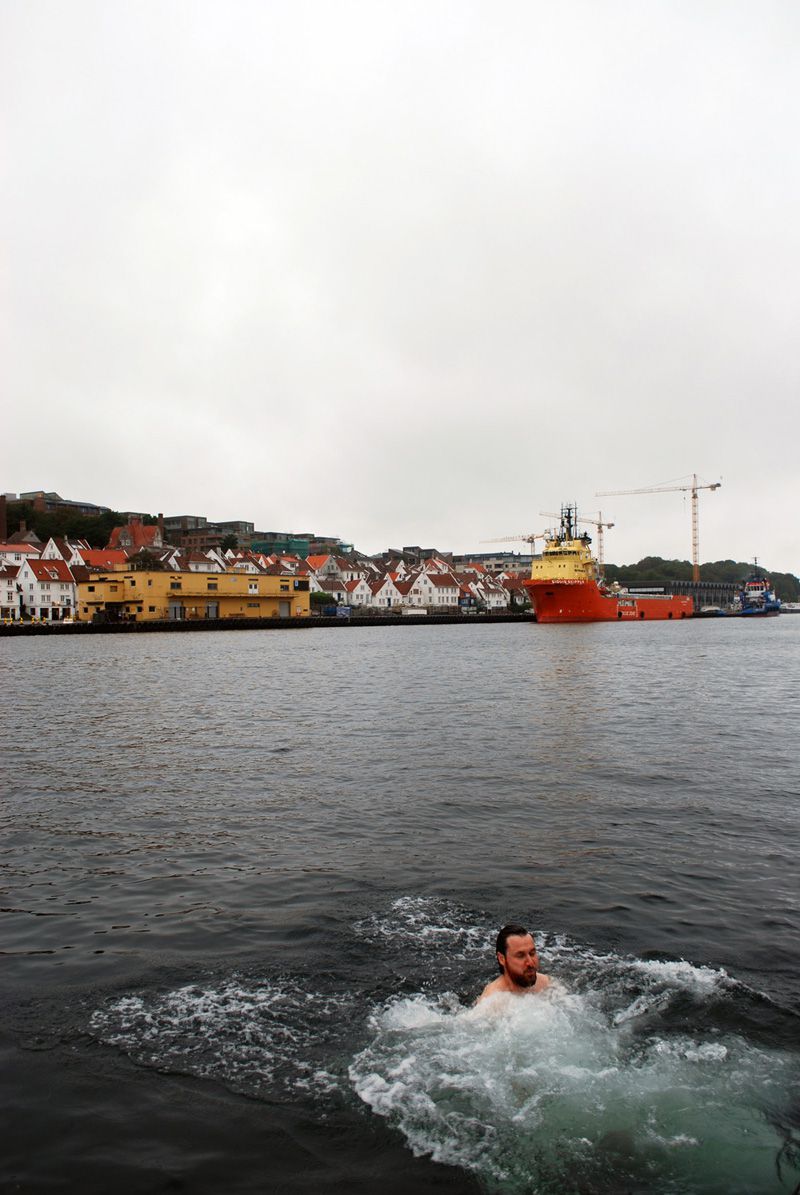Downey will attempt to swim across Stavanger via any body of public water he comes across until he reaches the north sea, perhaps England beckons. More realistically, Brads bloated putrefying corpse is carried by the Atlantic currents back up the east river to Brooklyn. More more realistically, boredom prevails and he towels himself off.