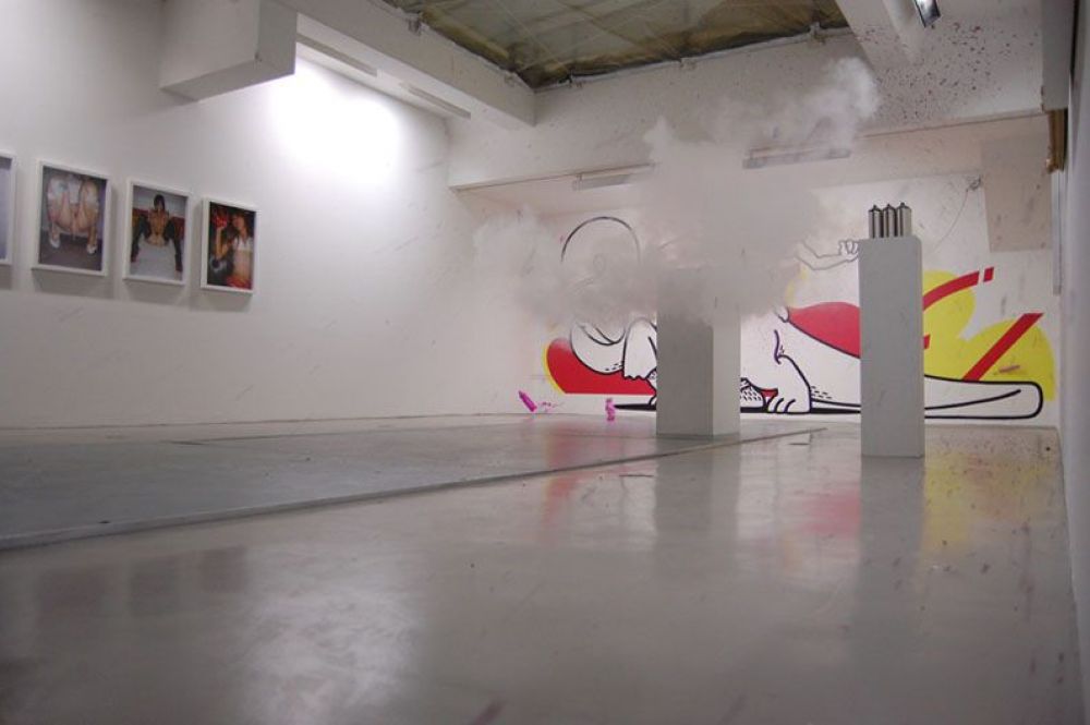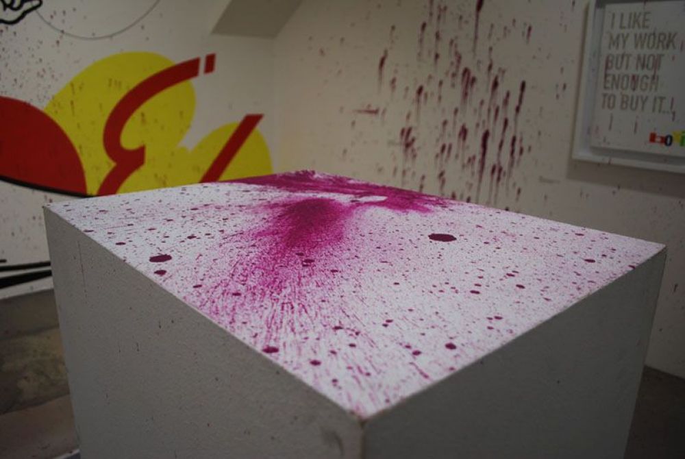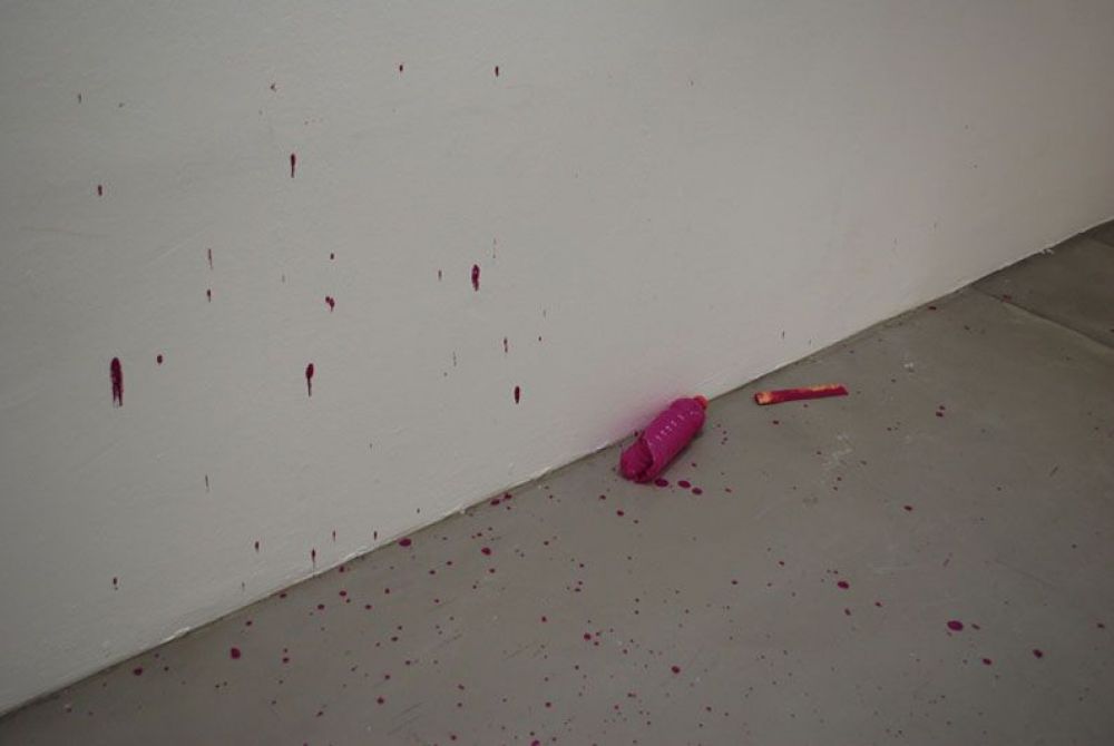 A color bomb is placed on a plinth in the exhibition room and detonated. The moment of explosion is a sculpture. It lasts for a split second and continues onto the walls architecture and exhibited works.
