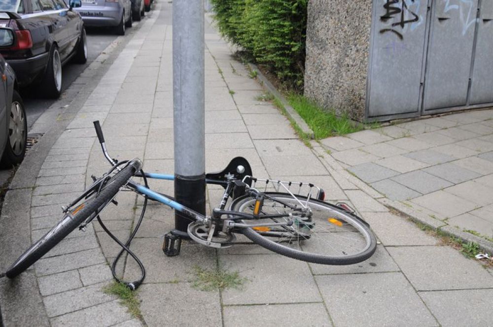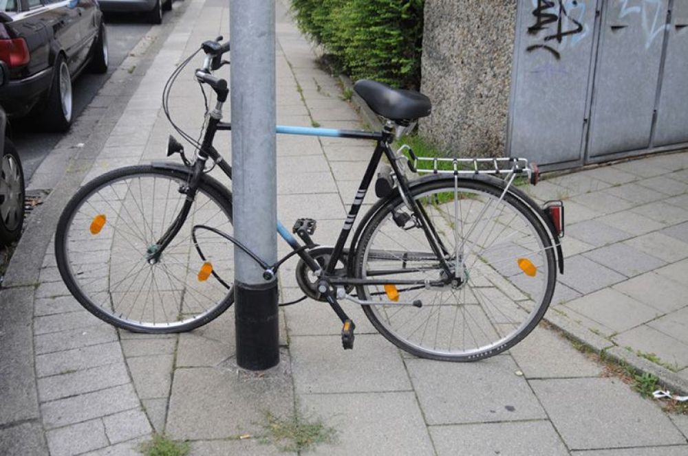 A bicycle locked by a chain to a lamp-post was lifted up along the length of the lamp-post, all the while staying attached to the post via the chain lock. The bicycle and lock together were then removed from the post at it’s very top. Afterwhich the lamp-post was inserted into the “middle” of the triangle of the bicycle frame. The bicycle is returned to near its original resting place. The original lock is not destroyed or altered and remains locked to the bike. The bike was not stolen but it is now definitely trapped. The owner of the bicycle can unlock their chain-lock but they cannot get the bicycle freed without some brainstorming.