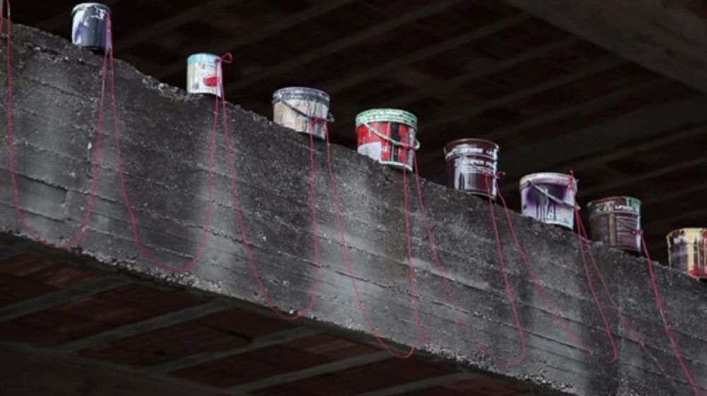 In the middle of Grottaglie, 250 liters of paint spilt over the edge of a multi-level parking garage, the buckets tipping over one-by-one.