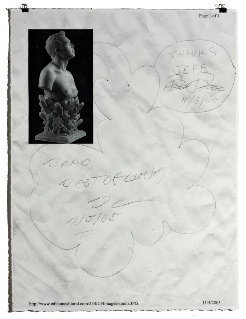 On May 11, 2005 I met Jeff Koons at Philips de Pury auction house in New York, New York. Coincidentally earlier that day, I printed out a photo of his iconic Self-Portrait; I approached Mr. Koons and showed him the printout.
