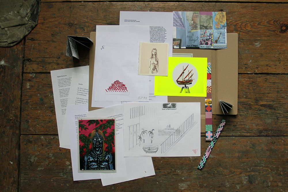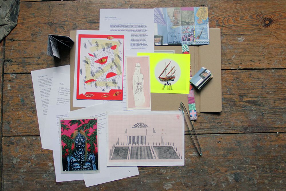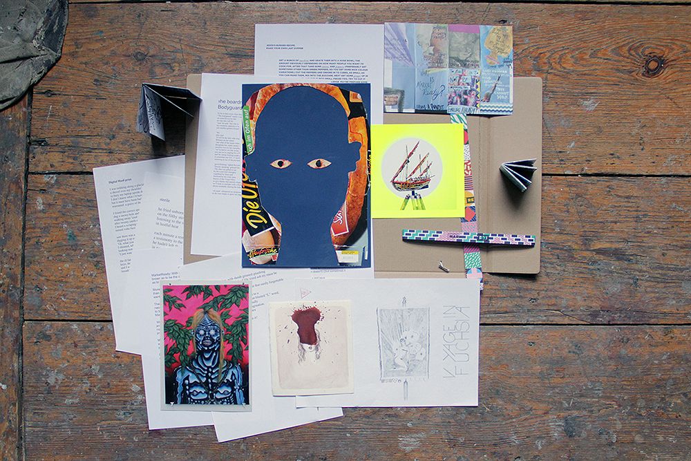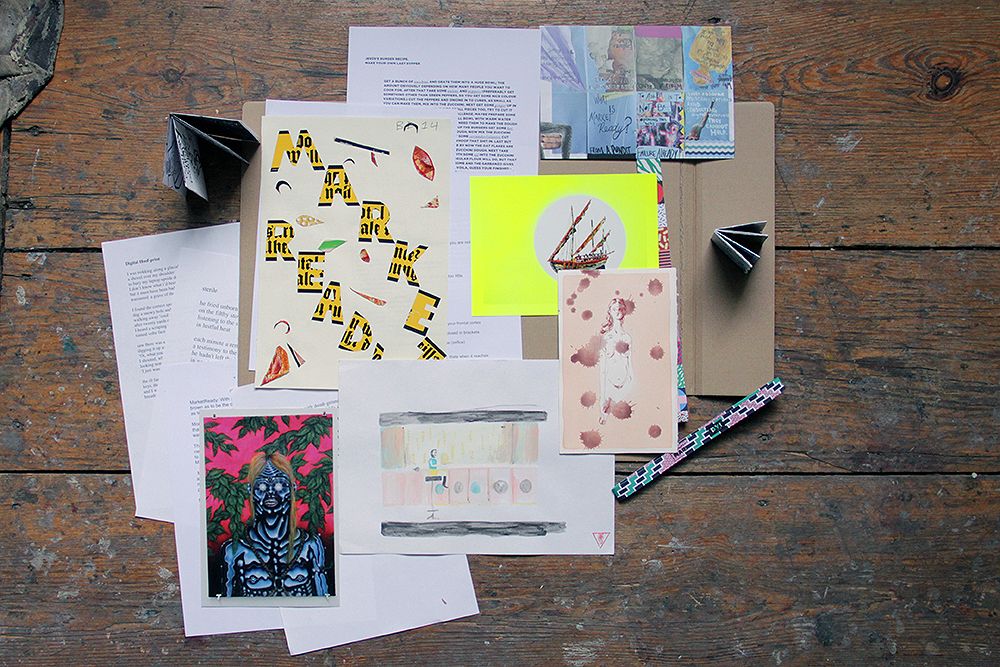 Two colour strips stamped Market Ready, Market Ready Minifesto, Market Ready biography, original work by Brad Downey, original work by Matthew Murphy, original work by Julien Fargetton, Original work by R.W.O. Stone, glossy photograph of an Erik Tidemann painting, recipe for Jesvs's Vegan Burgers, two poems by Rose Pacult, two poems by R.W.O. Stone, Handwritten letter from Mirelle Greta D'Algonquin