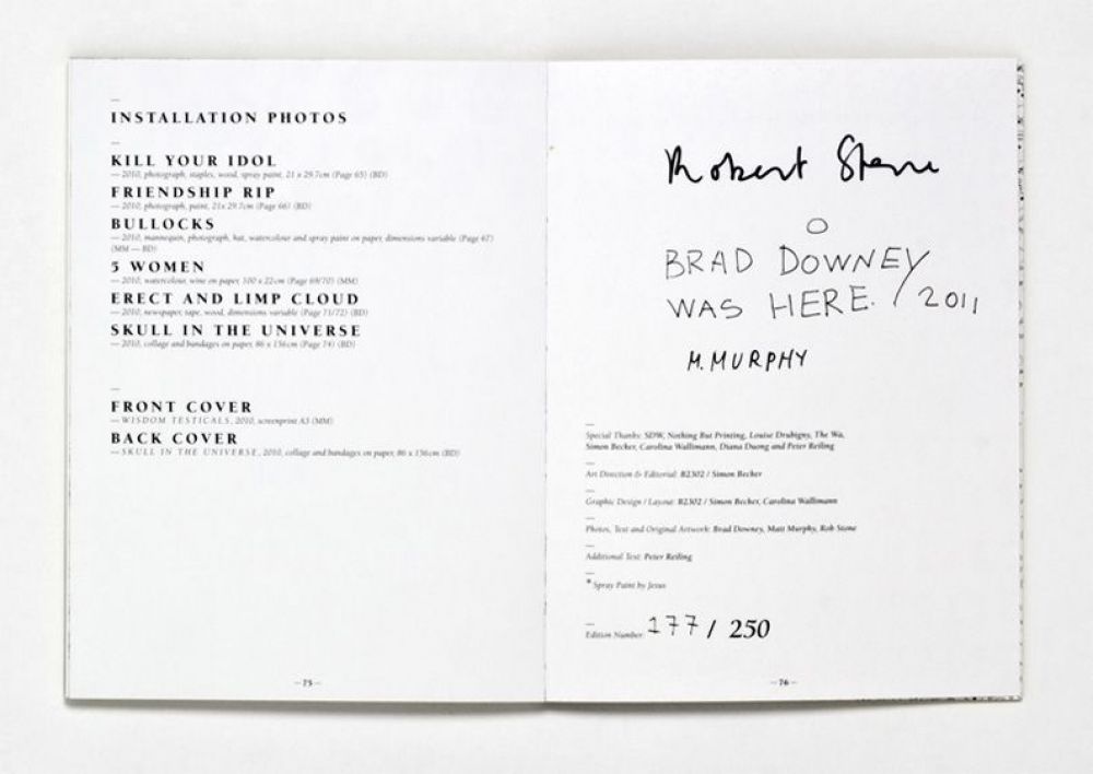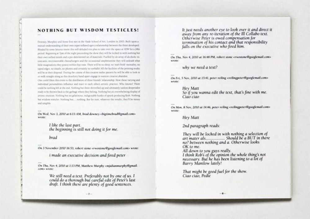 "Wisdom Testicles" is a collection of collaborative works made by Brad Downey, Matthew Murphy, and Robert Stone. The works were made over the course of 2010 at Murphy's apartment in Berlin and on the night of November 27, 2010, in the Siebdruckwerkstatt (SDW) gallery space in Berlin.
