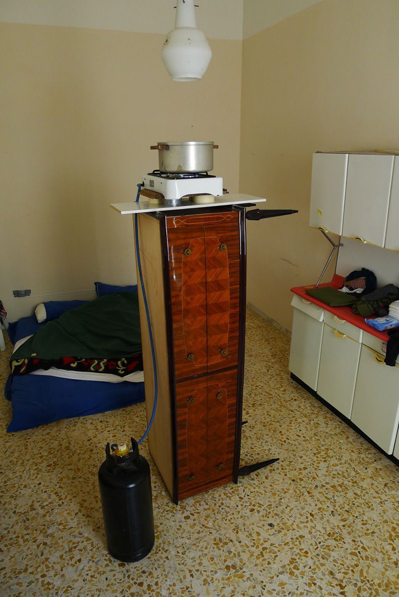 Material: rope, fan, metal bolt heater, metal pot, lamp, tape rolls, mixing stick, space heater, tape, plastic ball