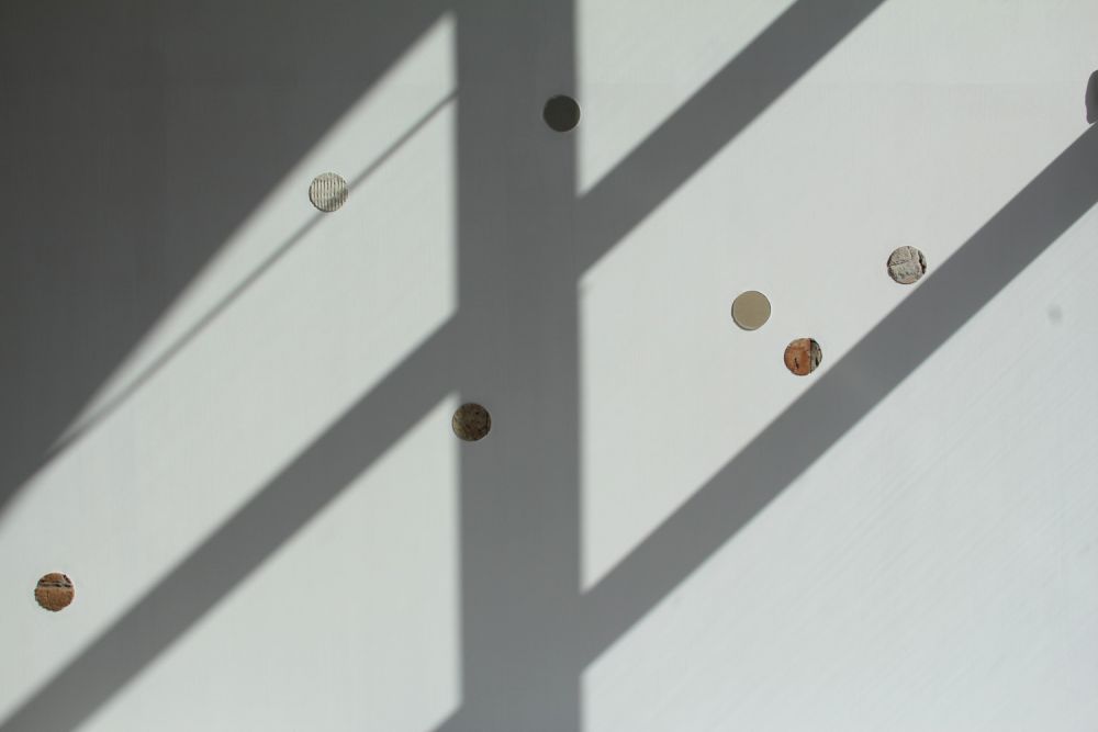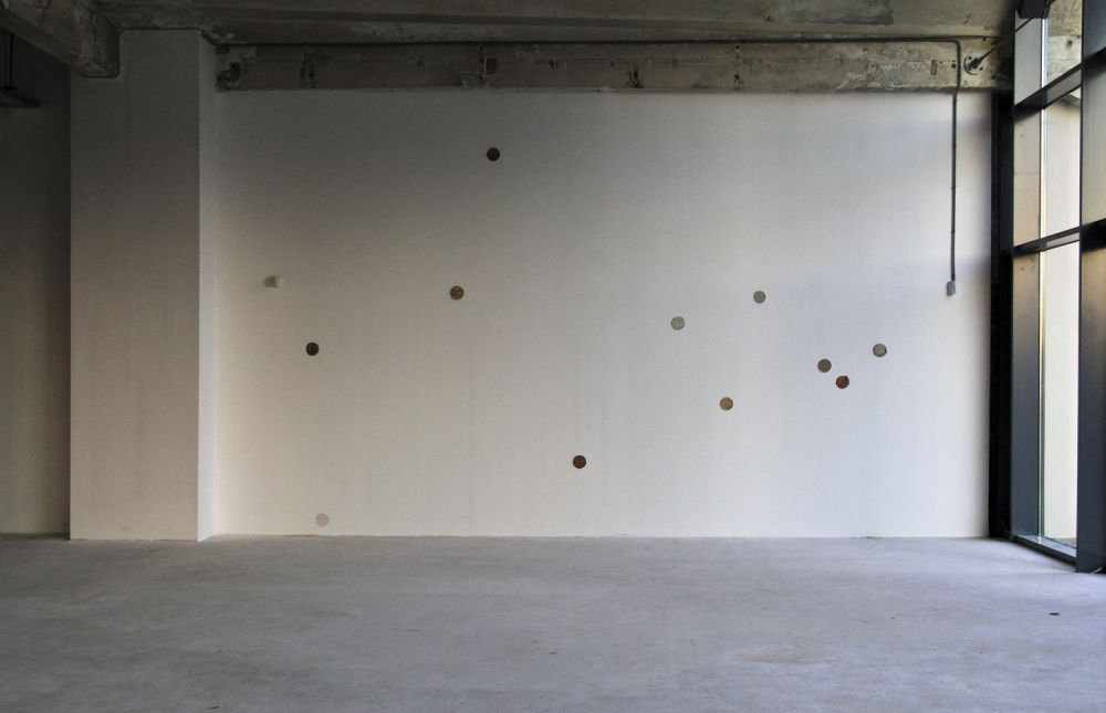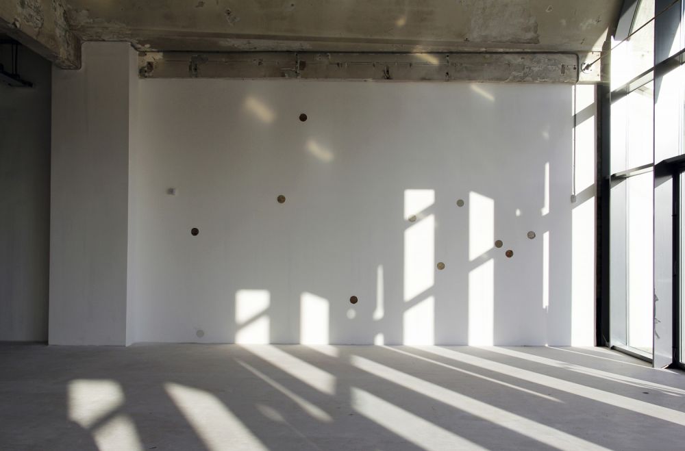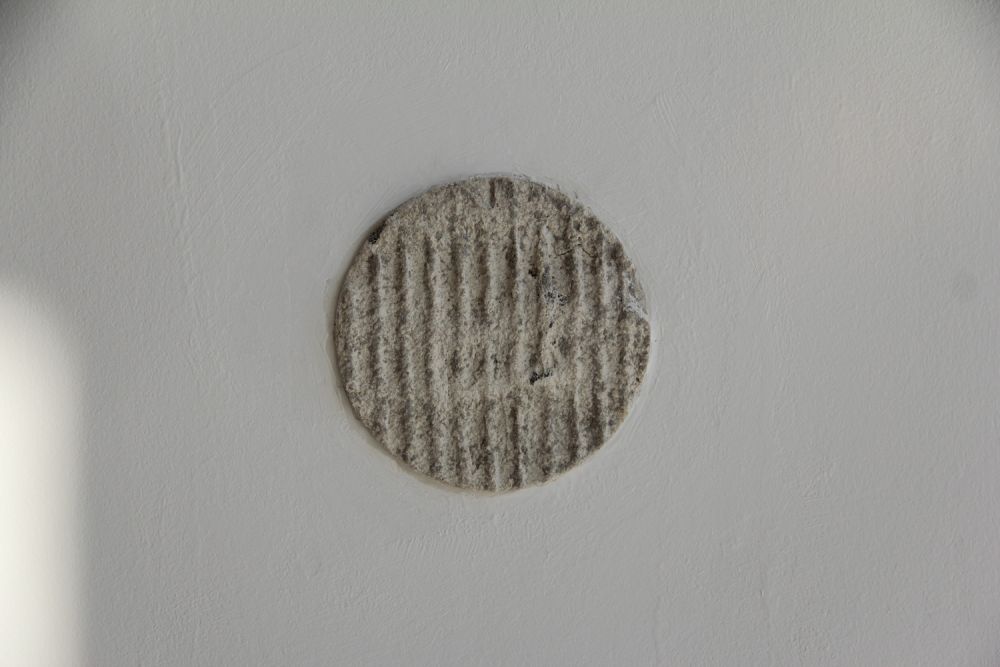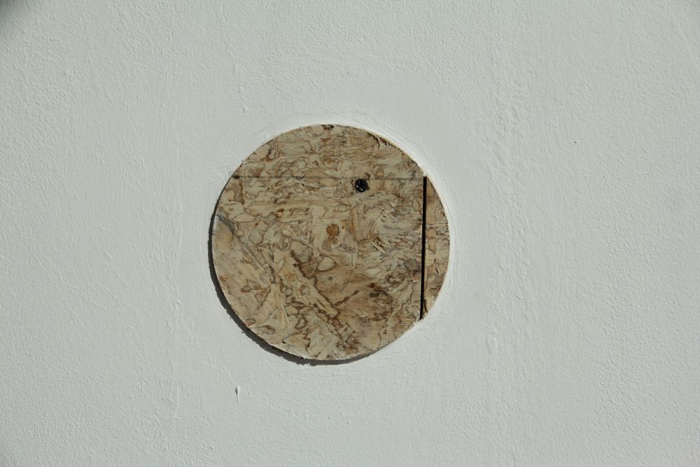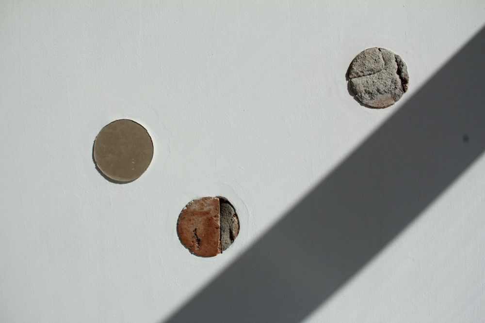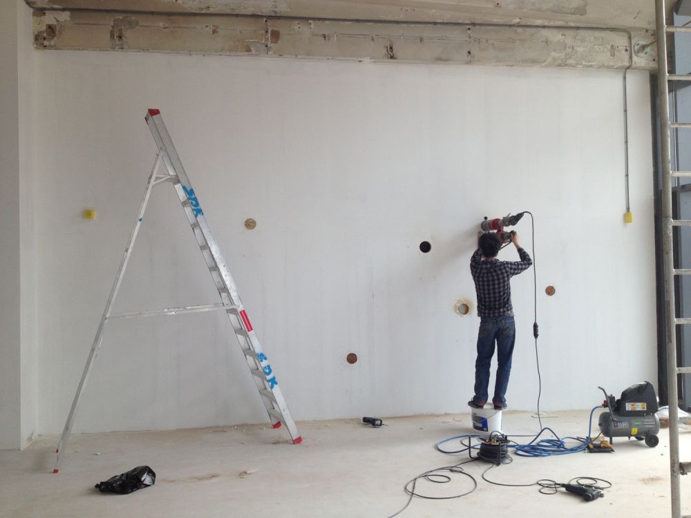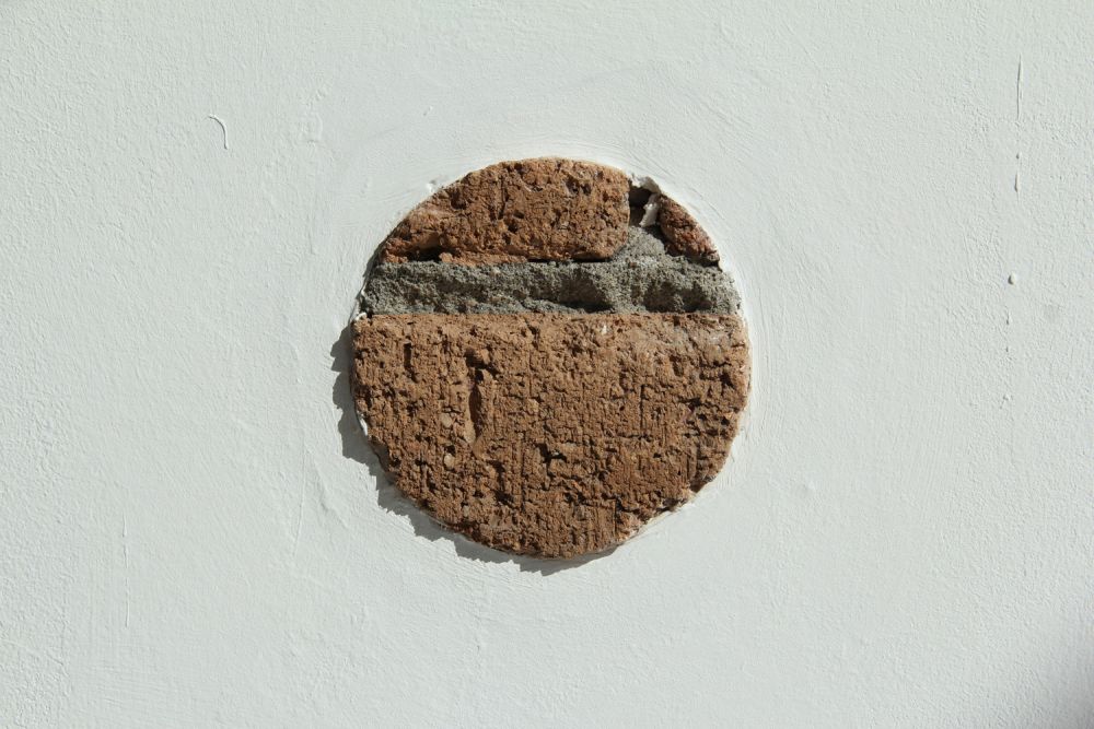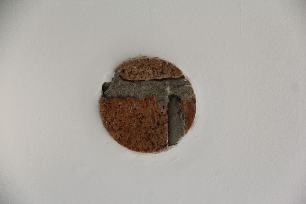 A wall in the MU Strijp-S artspace is made from a sandwich of different materials. These materials were isolated using an industrial drill. The back of the wall was visible from the corridor in front of the toilets.