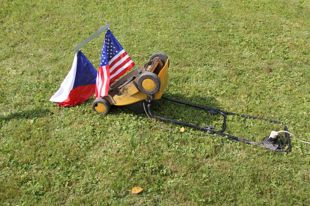Material: electric lawnmower, threaded bar, steel tubing, hex bolts, mini USA flag, mini Czech Republic