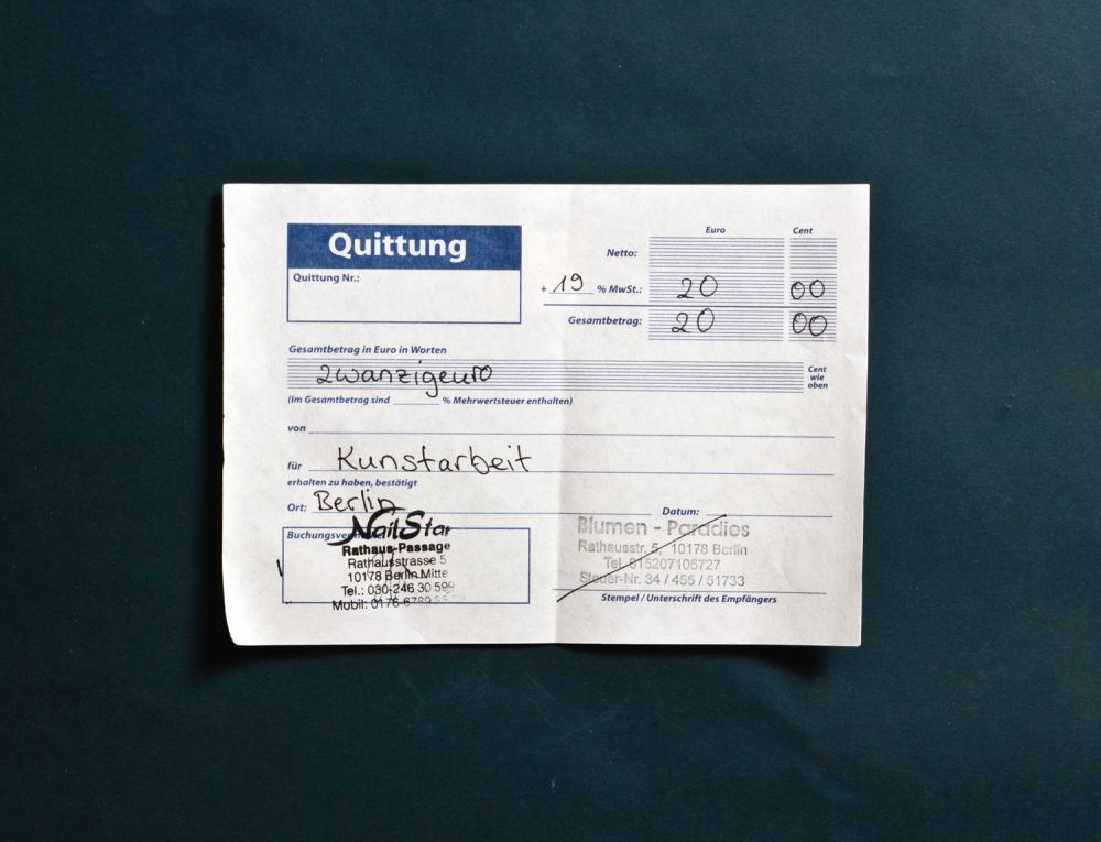 Downey commissioned the shop to paint a small, dirty rock he had found on the street in the same manner that they would a customer’s nails. He chose a range of elaborate graphic patterns featuring swirls, block colours and bubbles. They look like mini abstract artworks, and indeed the receipt – for 20 euros – describes the service rendered as ‘Kunstarbeit’ (art work). Does the term ‘Kunstarbeit’ refer to the nail art, or to the fact that the nail technician is aware of his role as the fabricator of another artist’s artwork? It is acceptable for an artist making a commissioned public artwork to delegate the fabrication of their piece, but what about the independent, non-commissioned artist – the graffiti artist, the street artist? Is there still a macho code that requires them always to work solo?