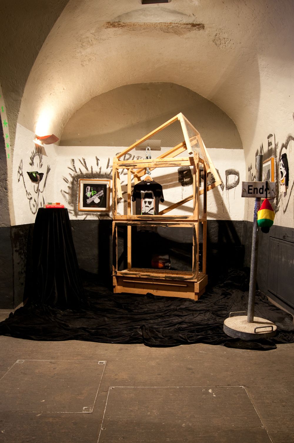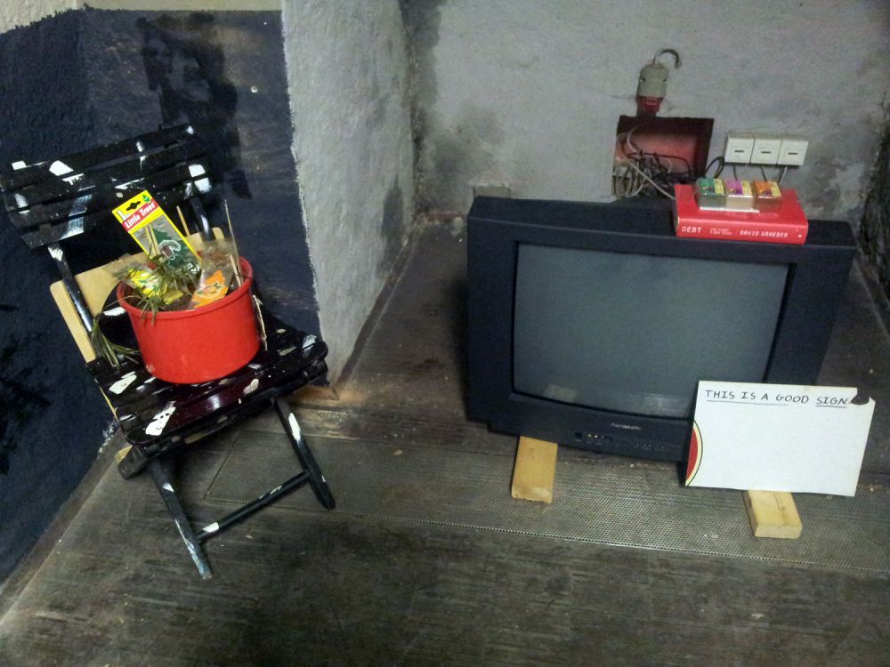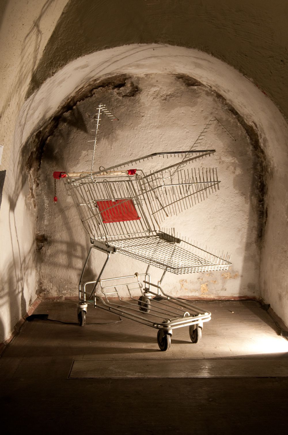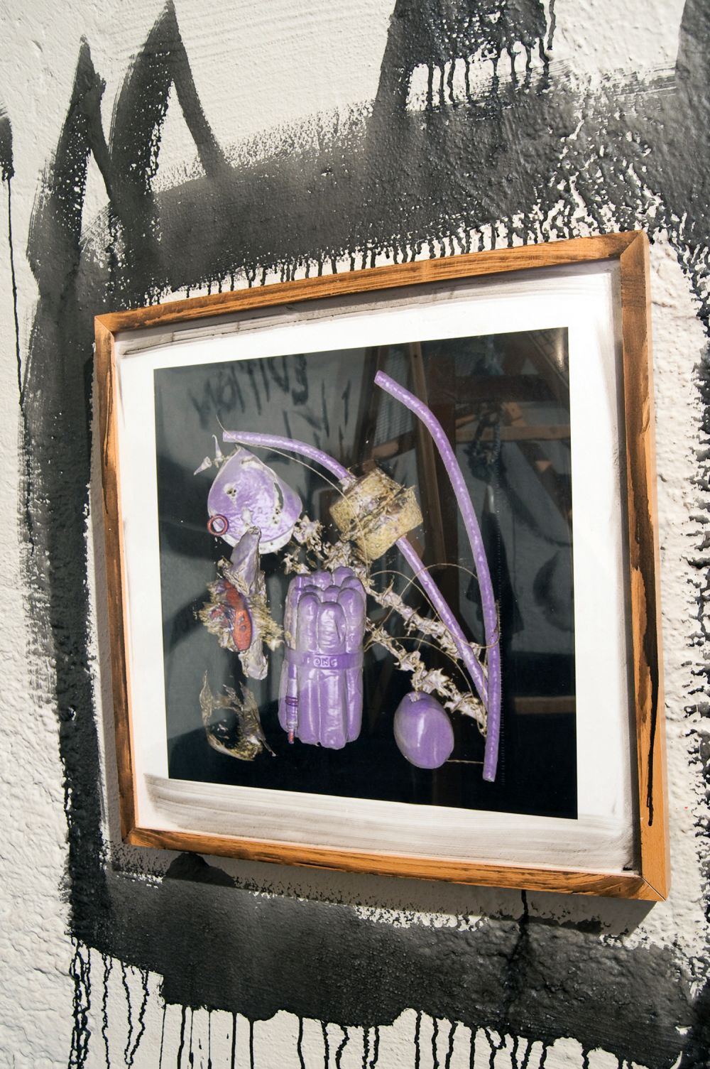 Material: shopping cart, street sign, x-rays, scream mask with mouse trap, heisenberger t-shirt with hair extensions, cheeto inserted in a confederate Flag hermit crab shell, I am happy incense, LMF hat with Levi’s denim trim attached around front, vacuum sealed unique adidas shoebox cover with hair extension and flower, plant with air fresheners (never let a plant stop smelling pleasant), bob Marley potpourri holder, occupy wall st. (dept by David Graebner book taped to 3 soaps), icy hot knees with pass to Chicago art institute, double faced bandana, charcoal on paper, paint, wooden bird cage