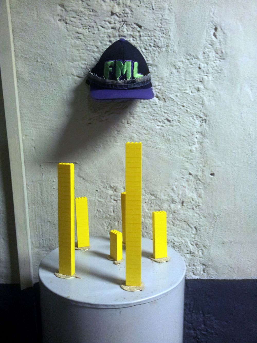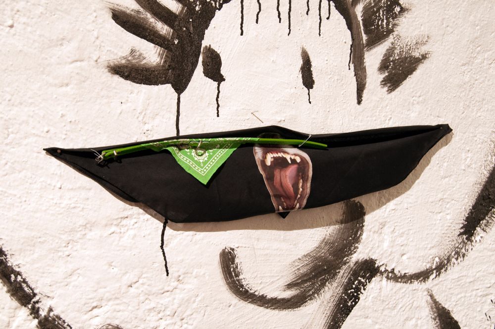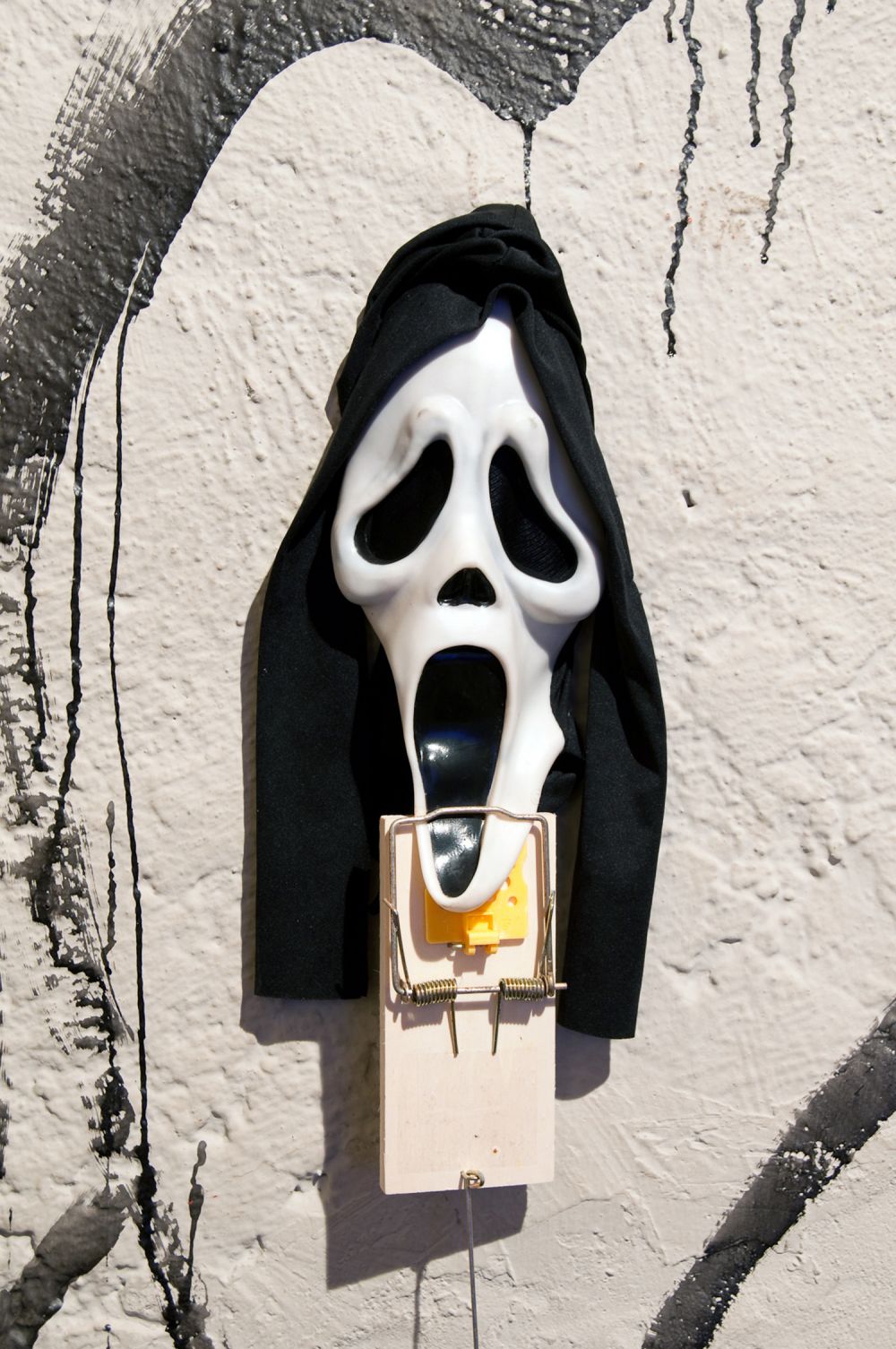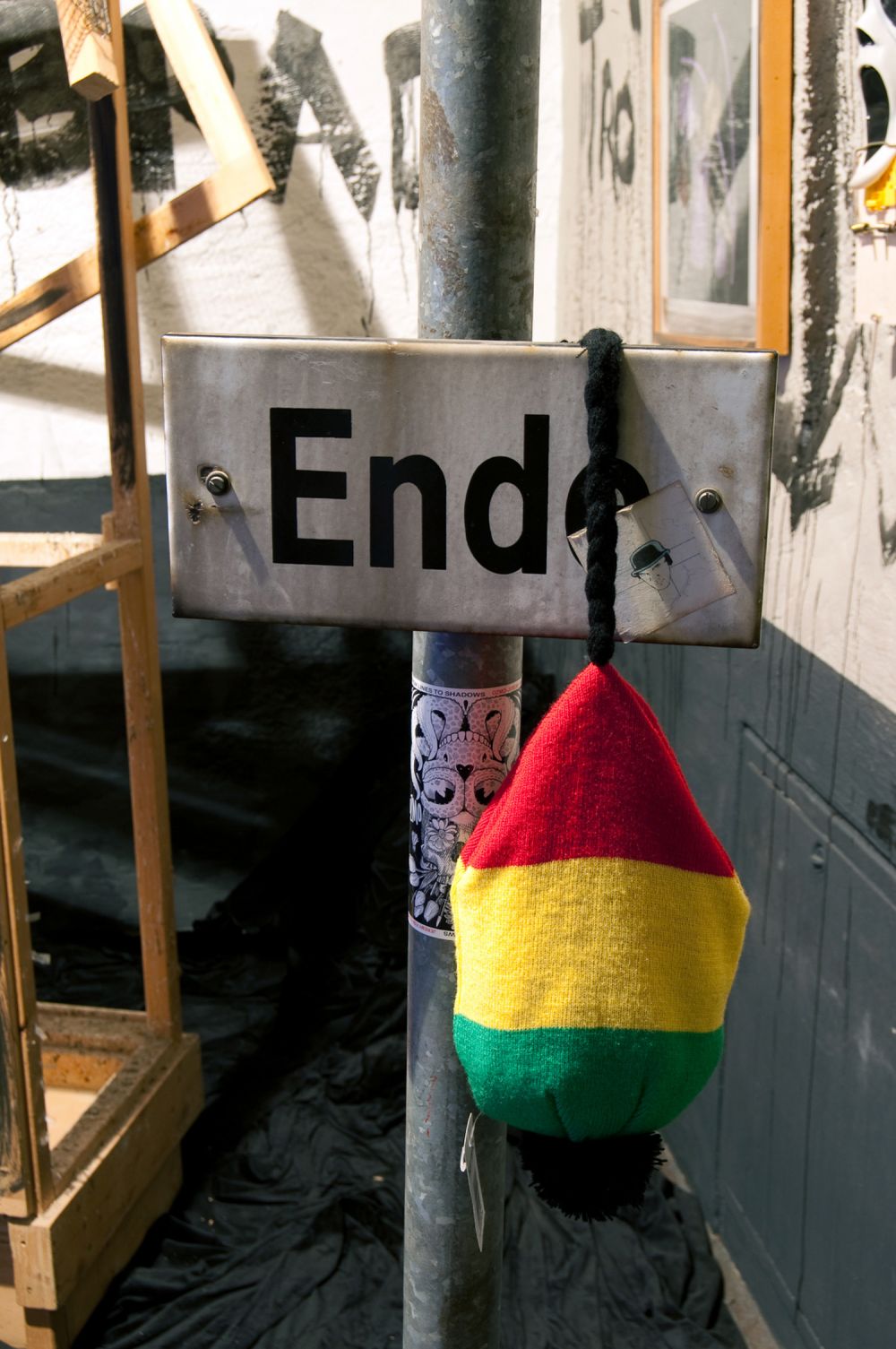 Material: shopping cart, street sign, x-rays, scream mask with mouse trap, heisenberger t-shirt with hair extensions, cheeto inserted in a confederate Flag hermit crab shell, I am happy incense, LMF hat with Levi’s denim trim attached around front, vacuum sealed unique adidas shoebox cover with hair extension and flower, plant with air fresheners (never let a plant stop smelling pleasant), bob Marley potpourri holder, occupy wall st. (dept by David Graebner book taped to 3 soaps), icy hot knees with pass to Chicago art institute, double faced bandana, charcoal on paper, paint, wooden bird cage