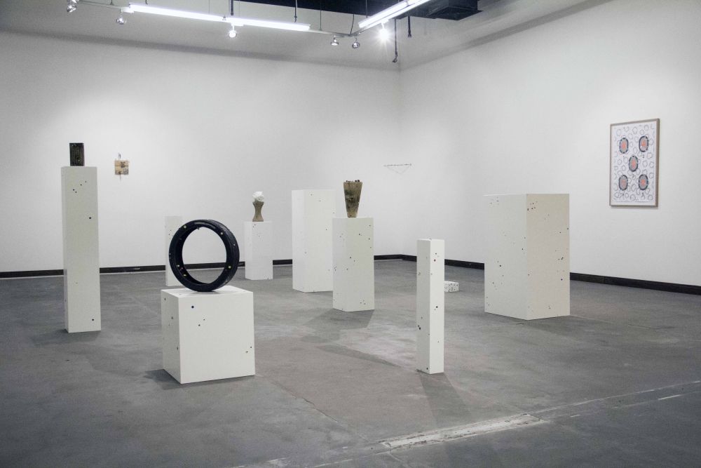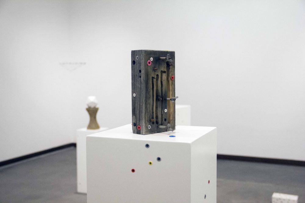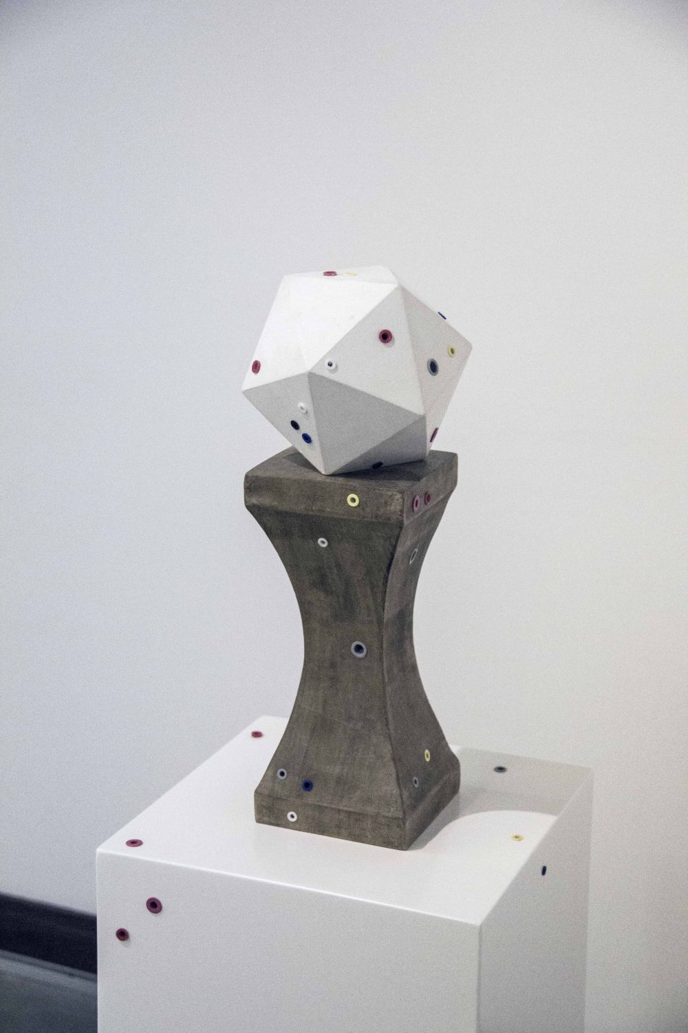 In one room of the exhibition, Brad Downey has constructed sculptures from the very materials that are ordinarily used to install art work the candy colored plugs that secure heavy pieces to a wall, and the plinths that support sculptures. On a few of these he has installed what he calls "plugged lumps."