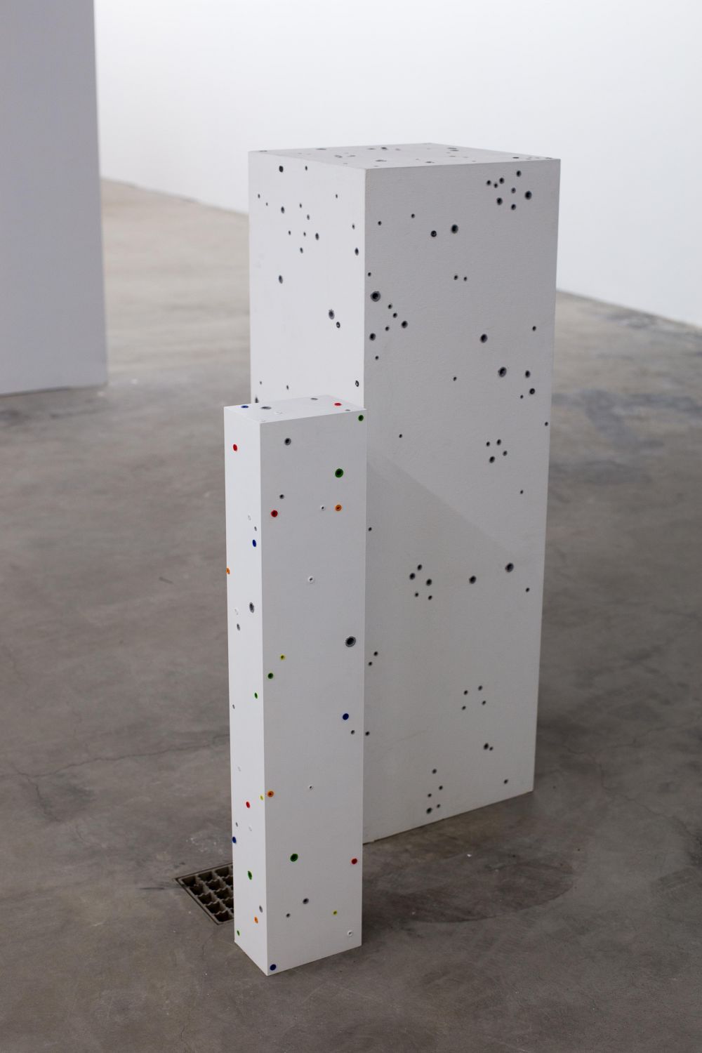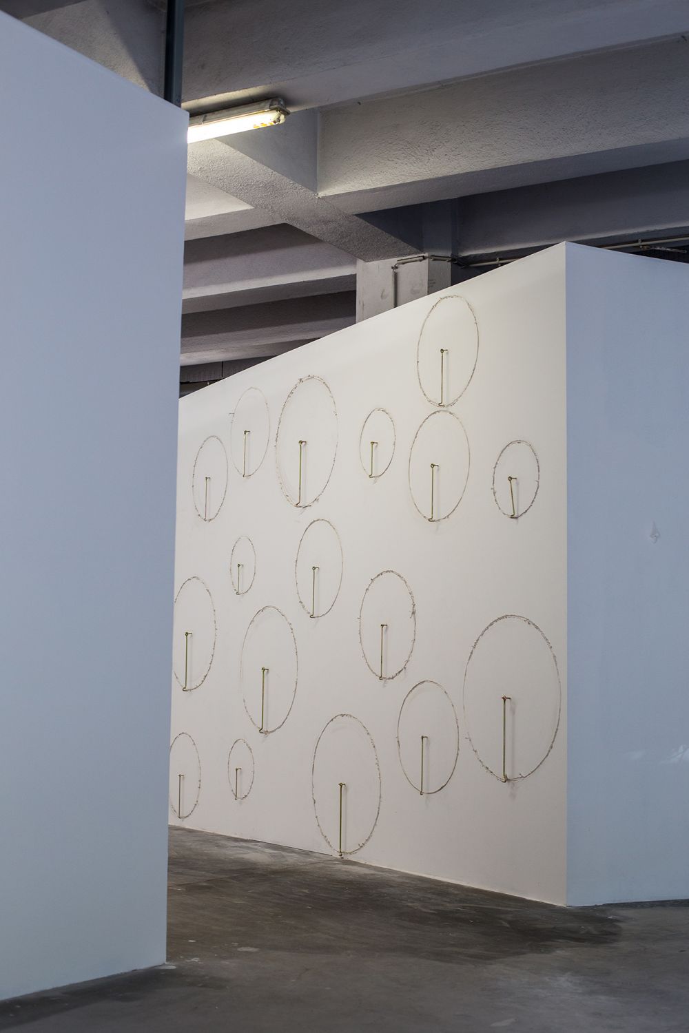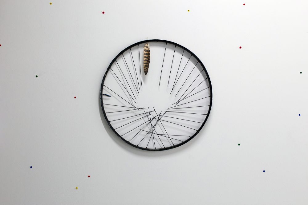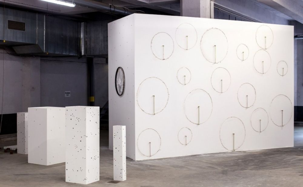 Material: plaster, glue, wall plugs, metal hooks, meat, paving stones, 3 digital videos, bike wheel, nails, feathers, paint