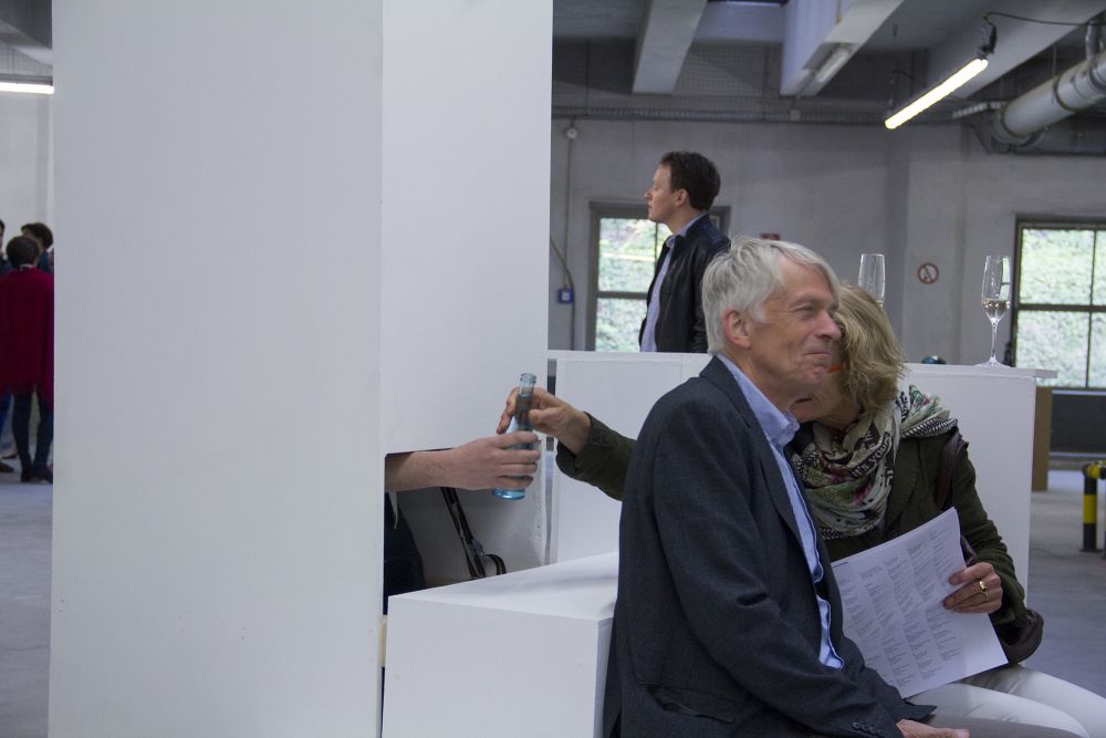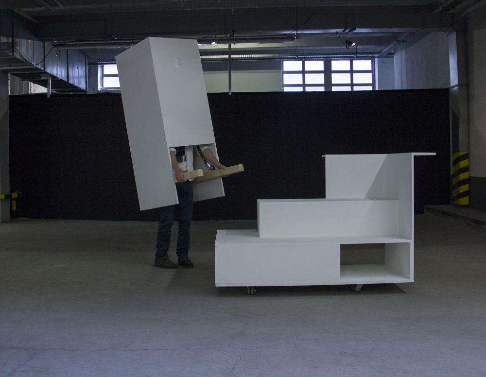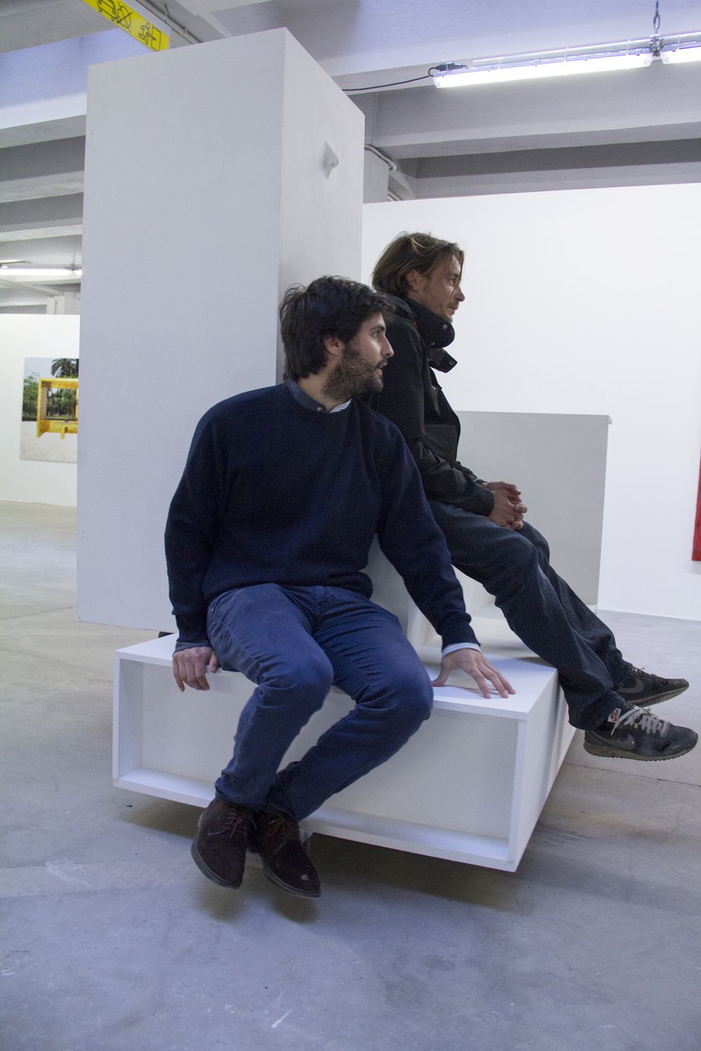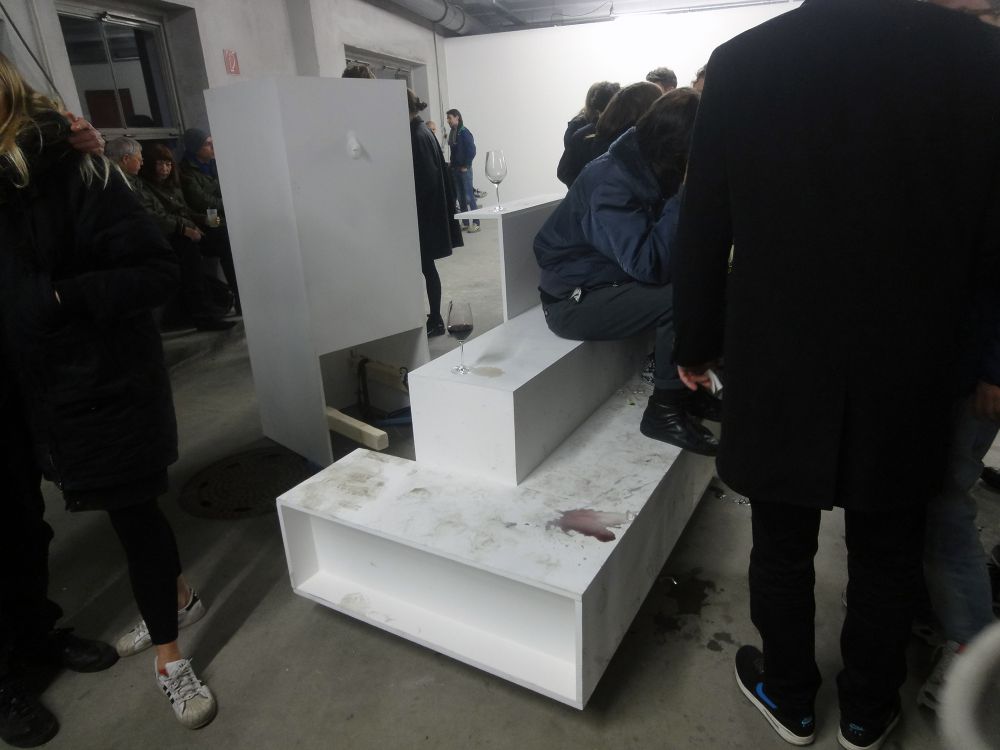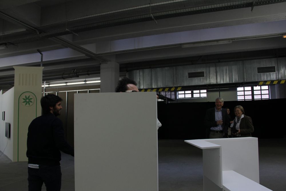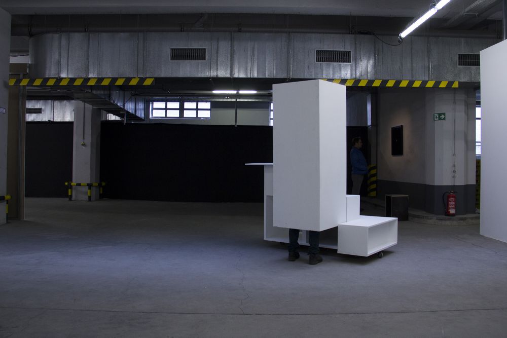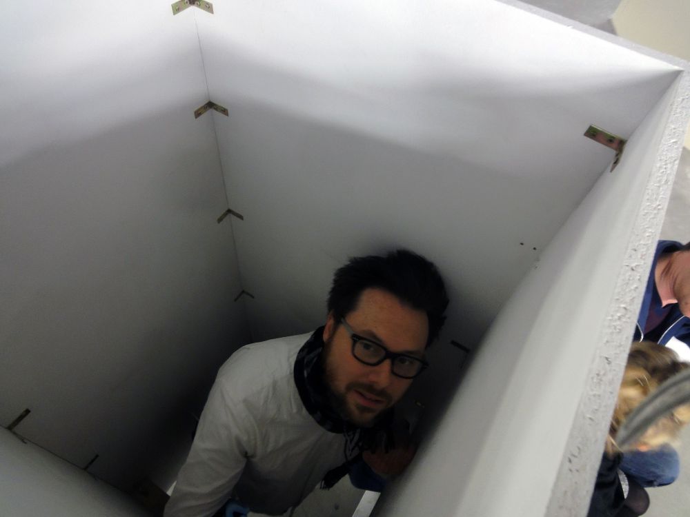 An architectural suit is designed to fit around Brad. The artist becomes the exhibition. The artist becomes the display. The display moves. The artist becomes a place to lean on while you look at art. The artist is place to put your empty champagne glass.