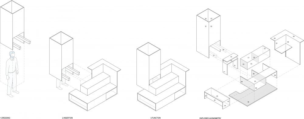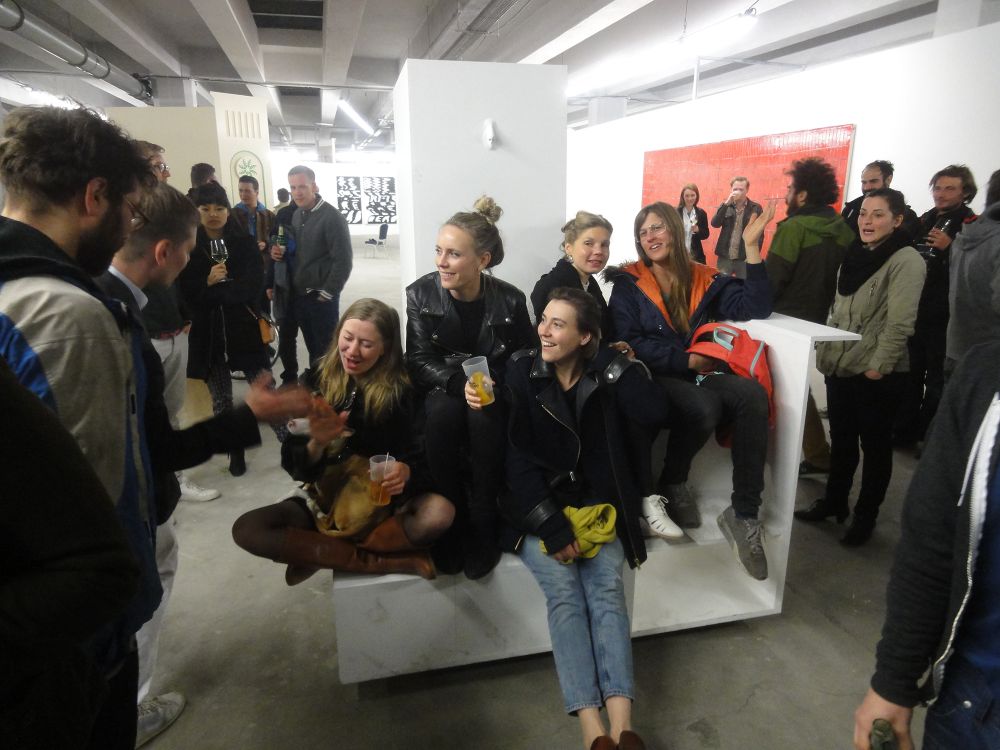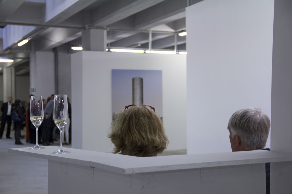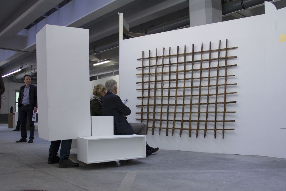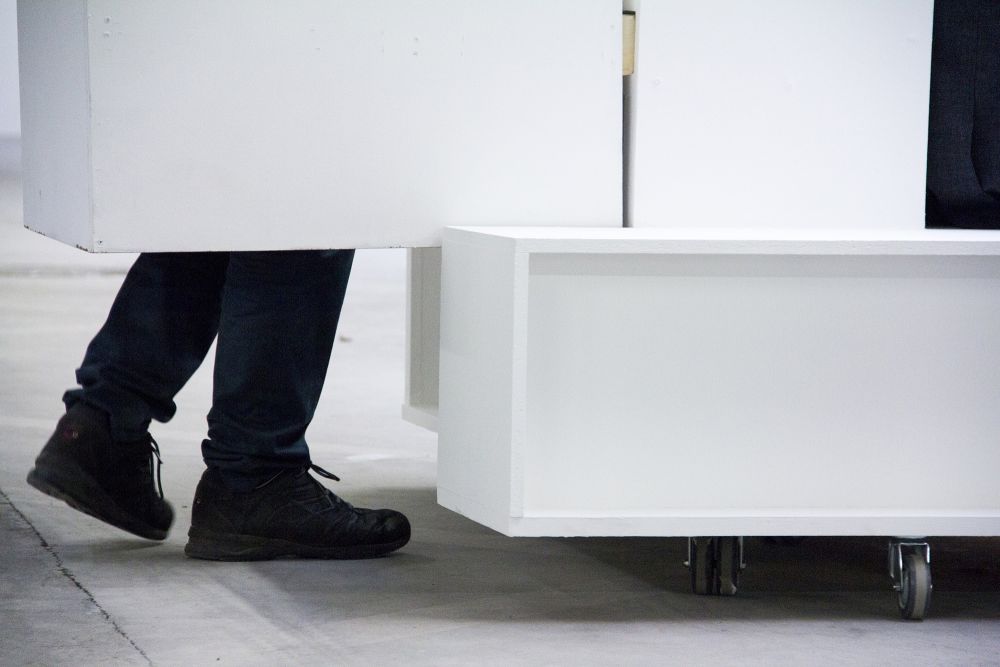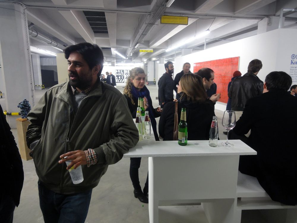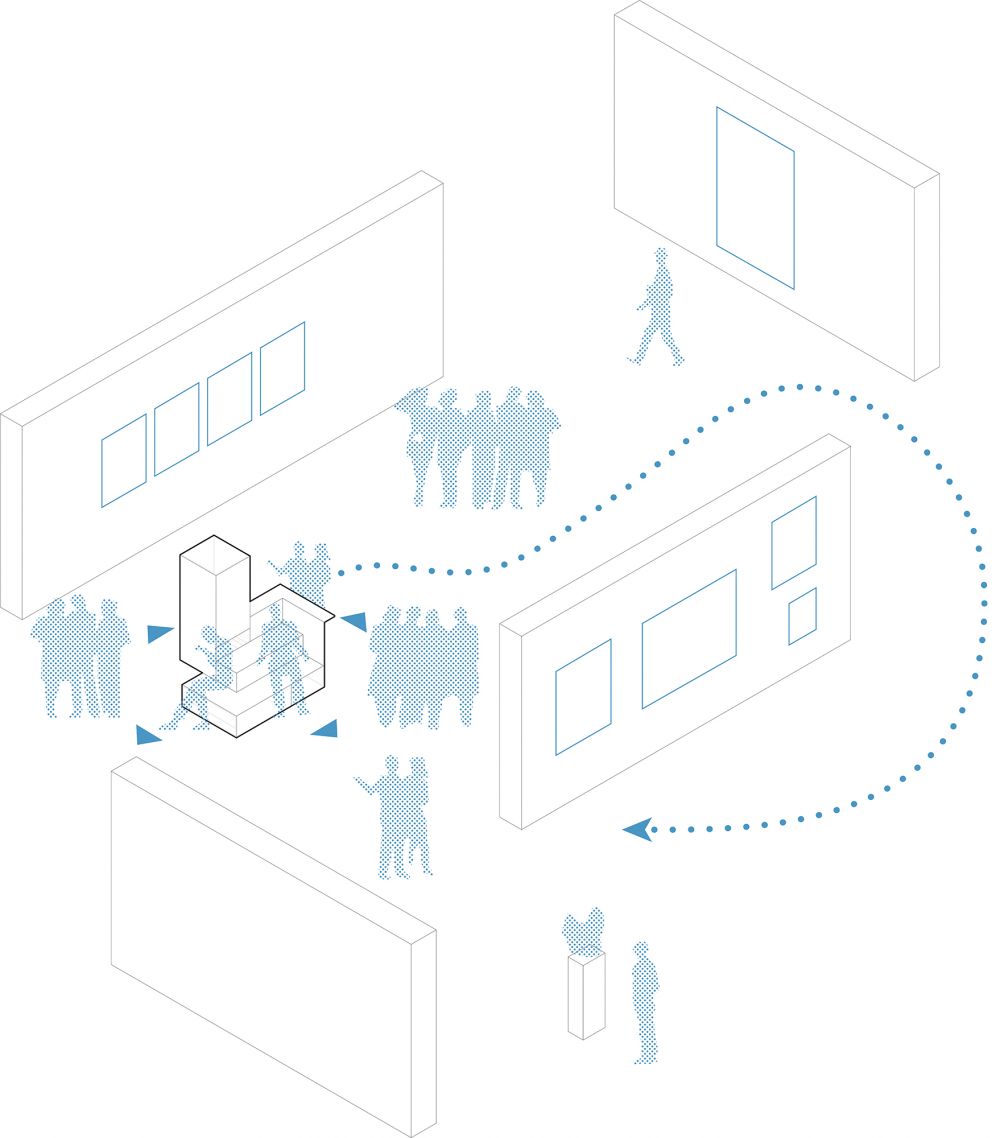 An architectural suit is designed to fit around Brad. The artist becomes the exhibition. The artist becomes the display. The display moves. The artist becomes a place to lean on while you look at art. The artist is place to put your empty champagne glass.