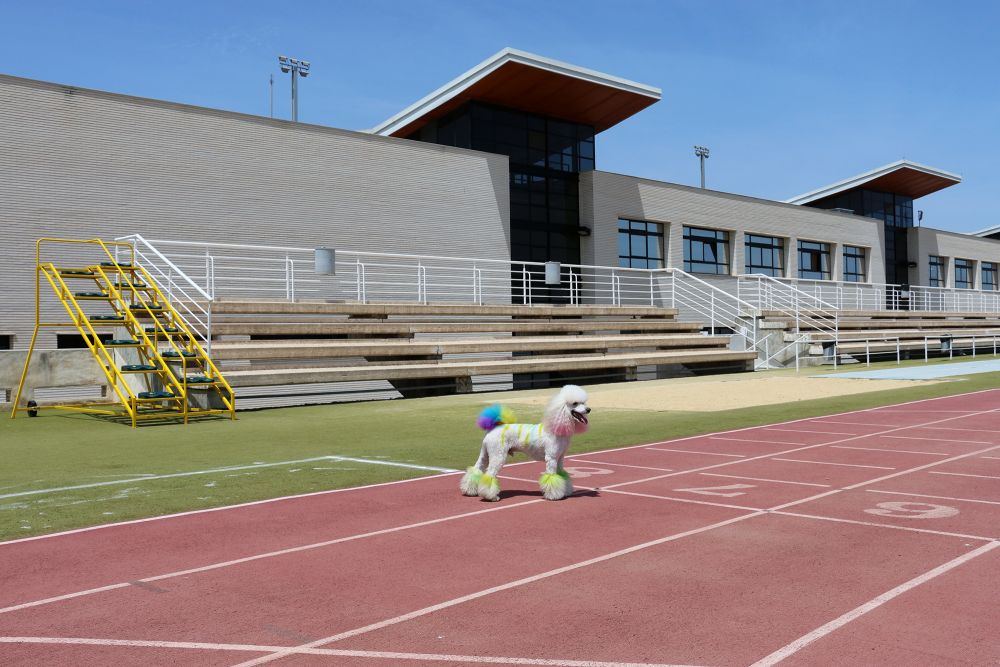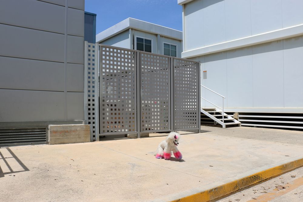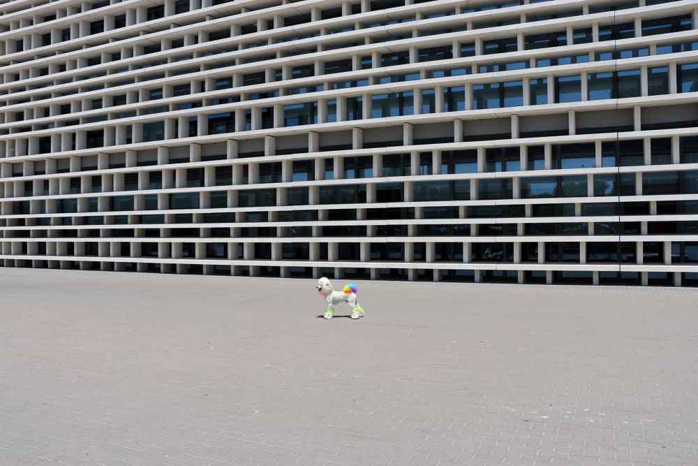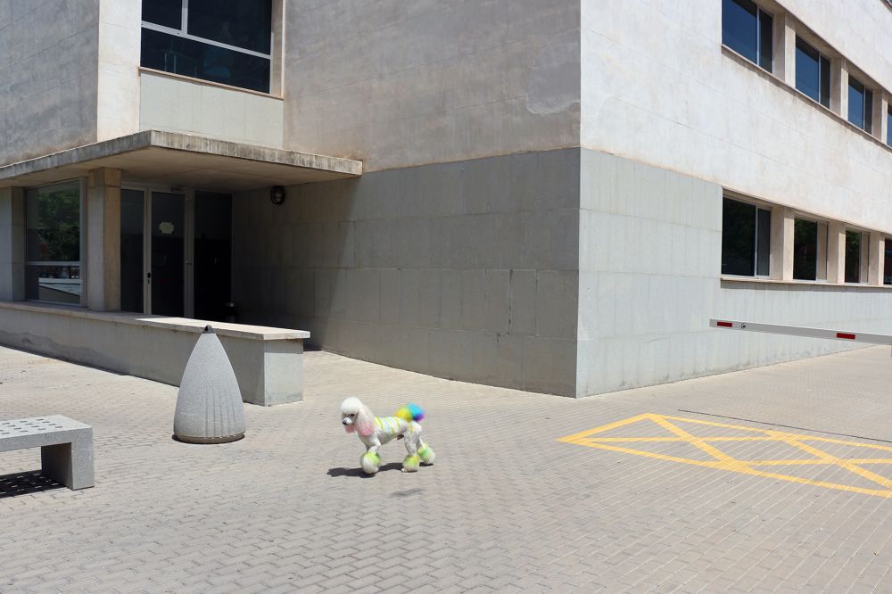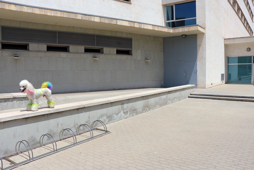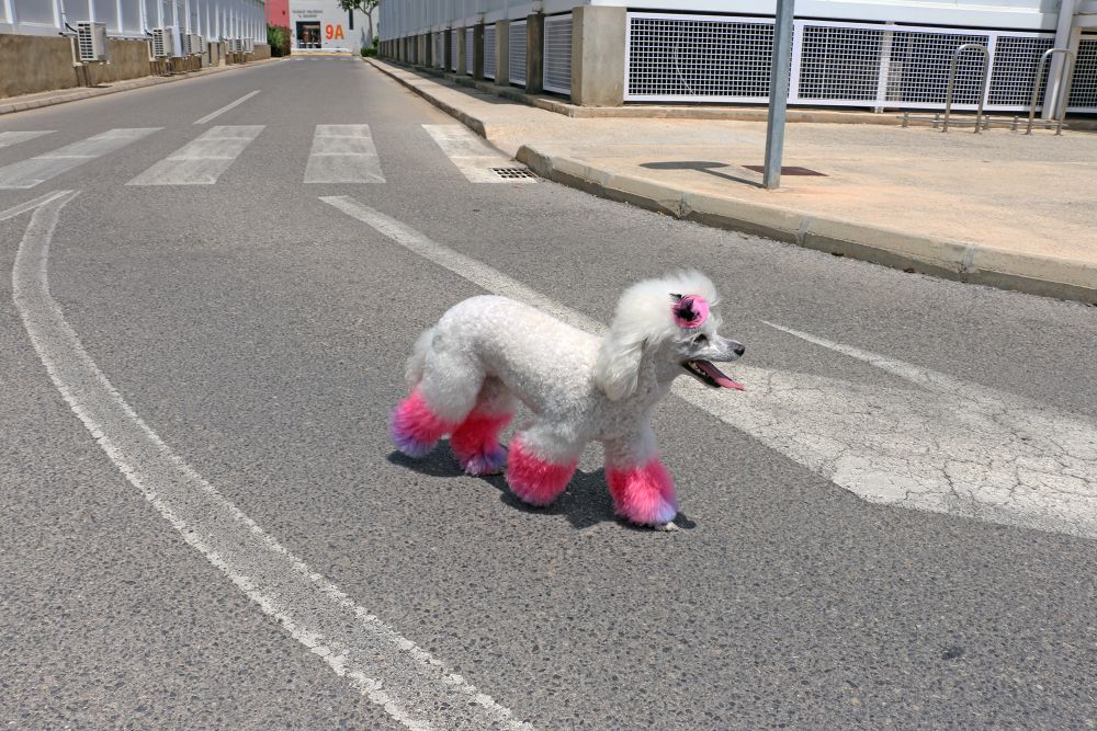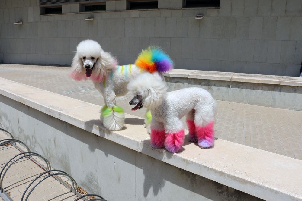 Two poodles dyed with bright colours and photographed in empty urban spaces
