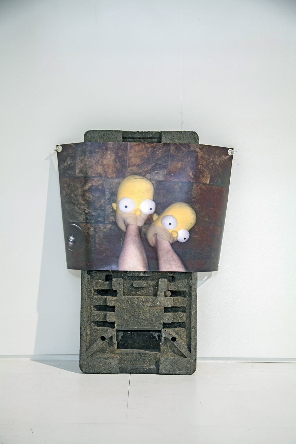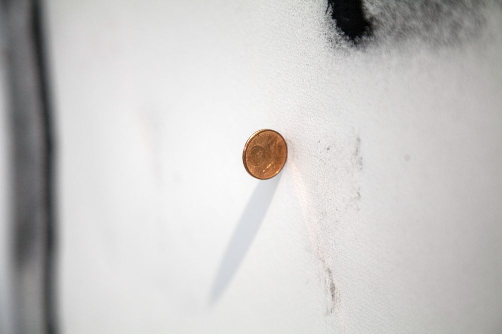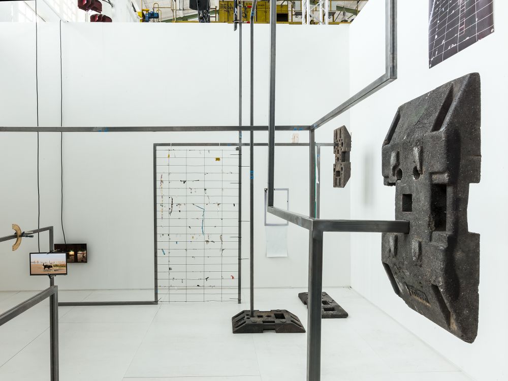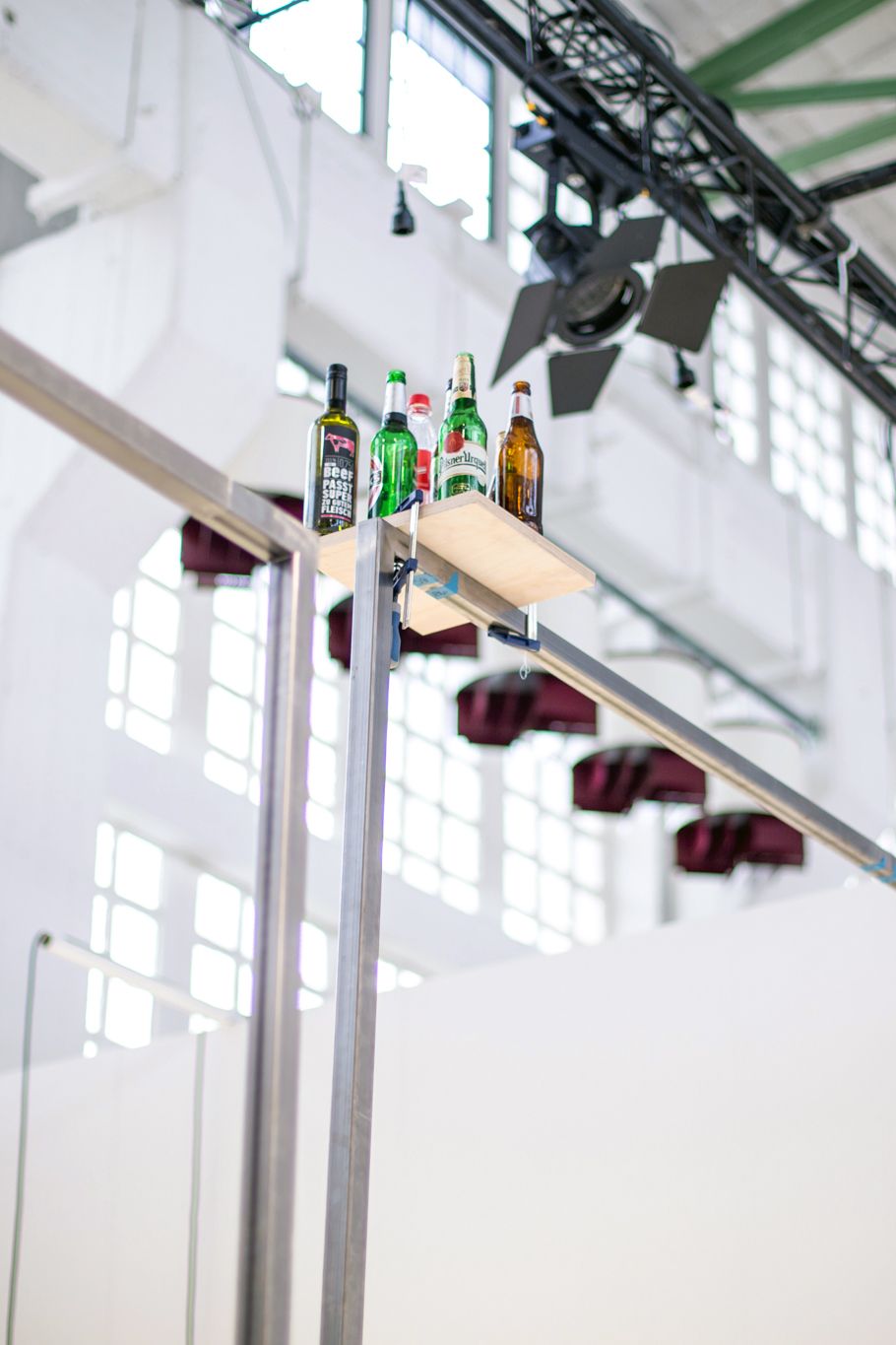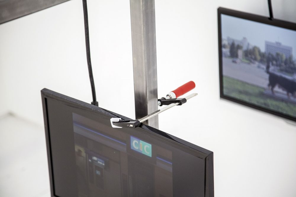 Material: steel, plastic weights, mounting hardware, wood, monitors, banners, clamps, bottles, magnets, coins, ceramics, spray paint and industrial marker on paper, cable ties, extensions