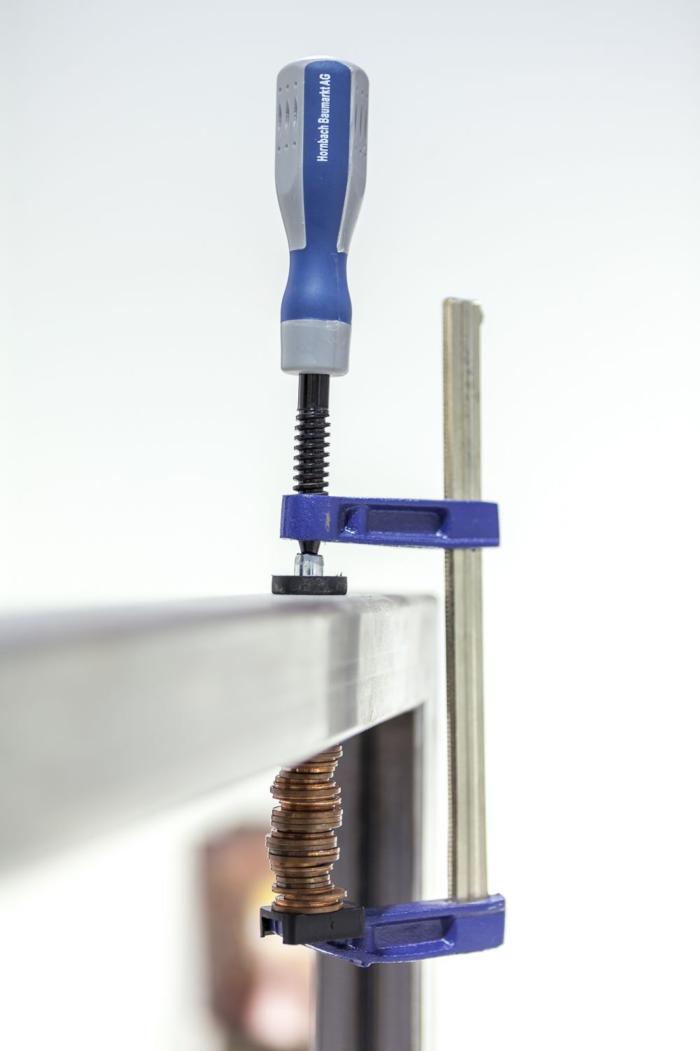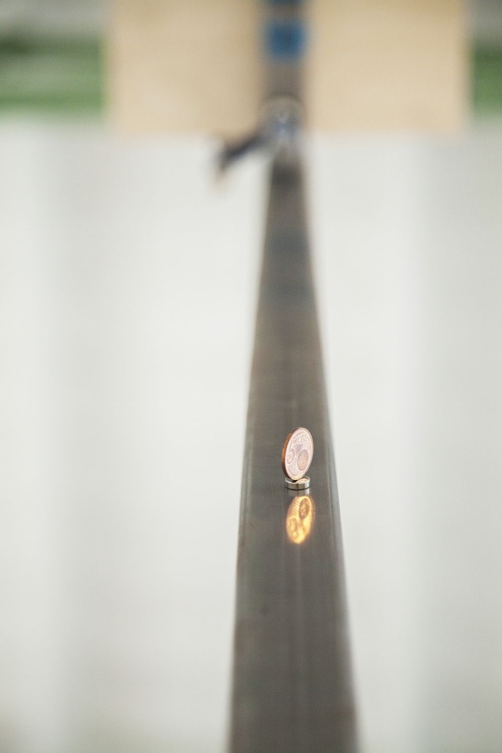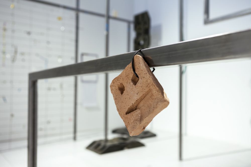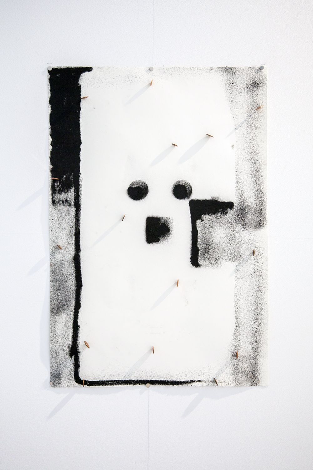 Material: steel, plastic weights, mounting hardware, wood, monitors, banners, clamps, bottles, magnets, coins, ceramics, spray paint and industrial marker on paper, cable ties, extensions