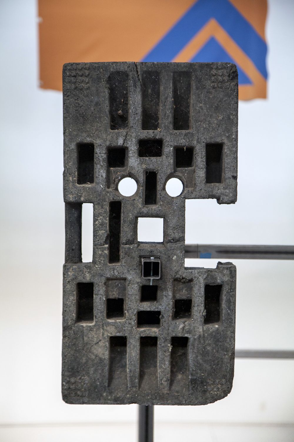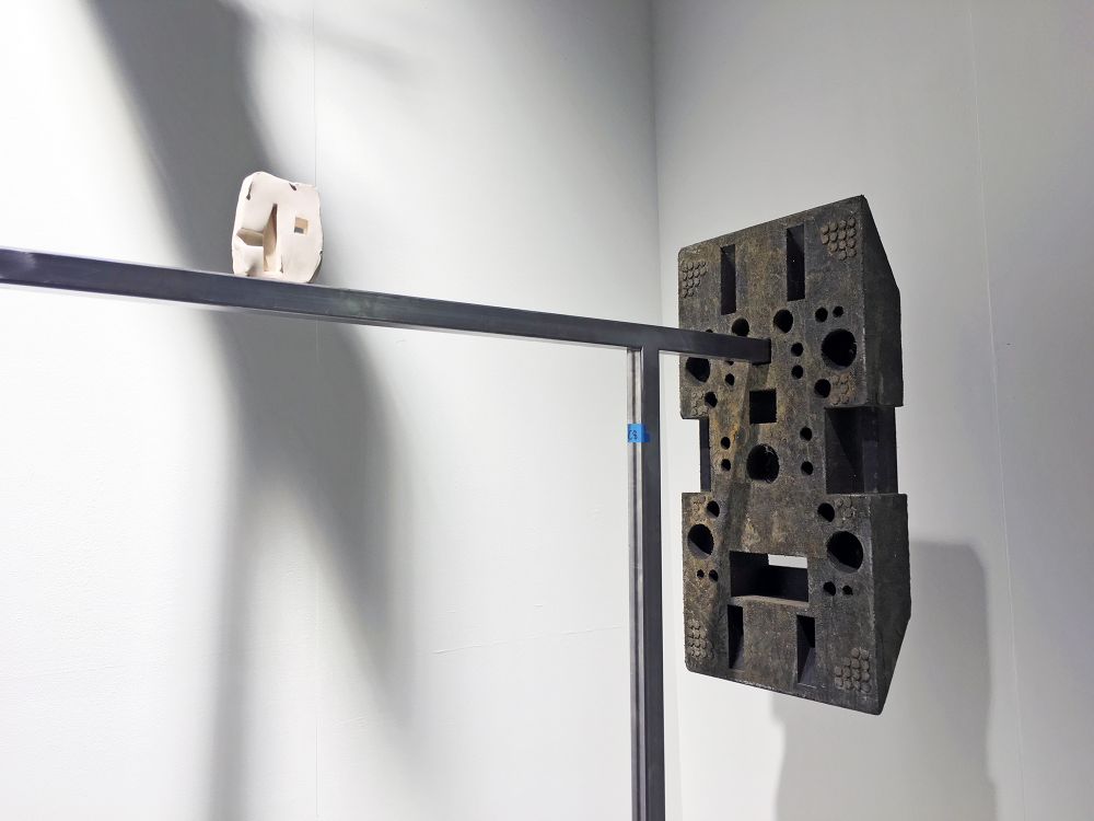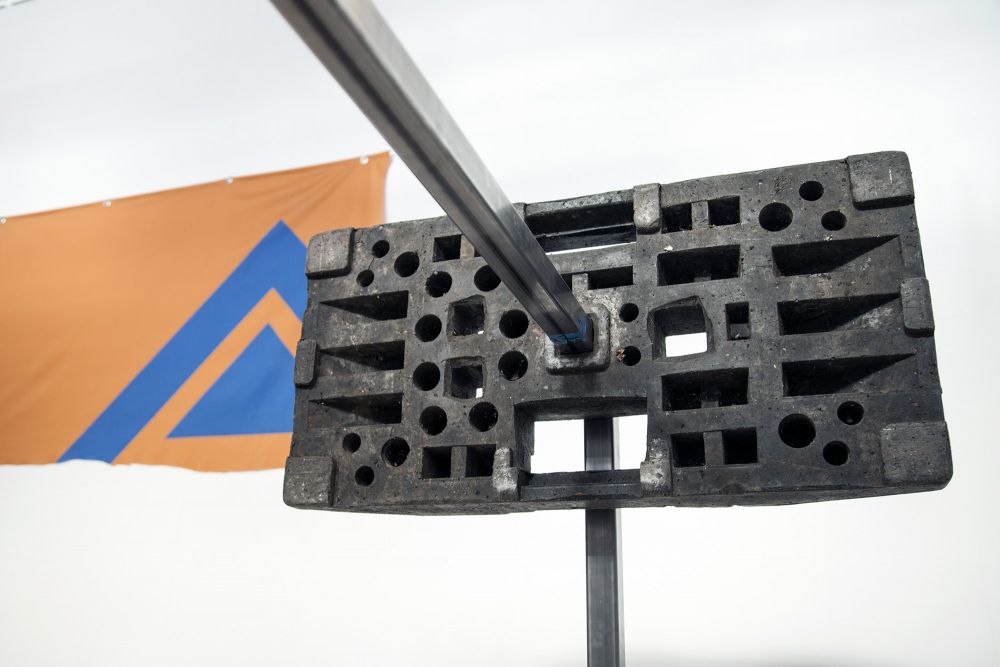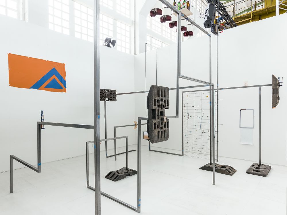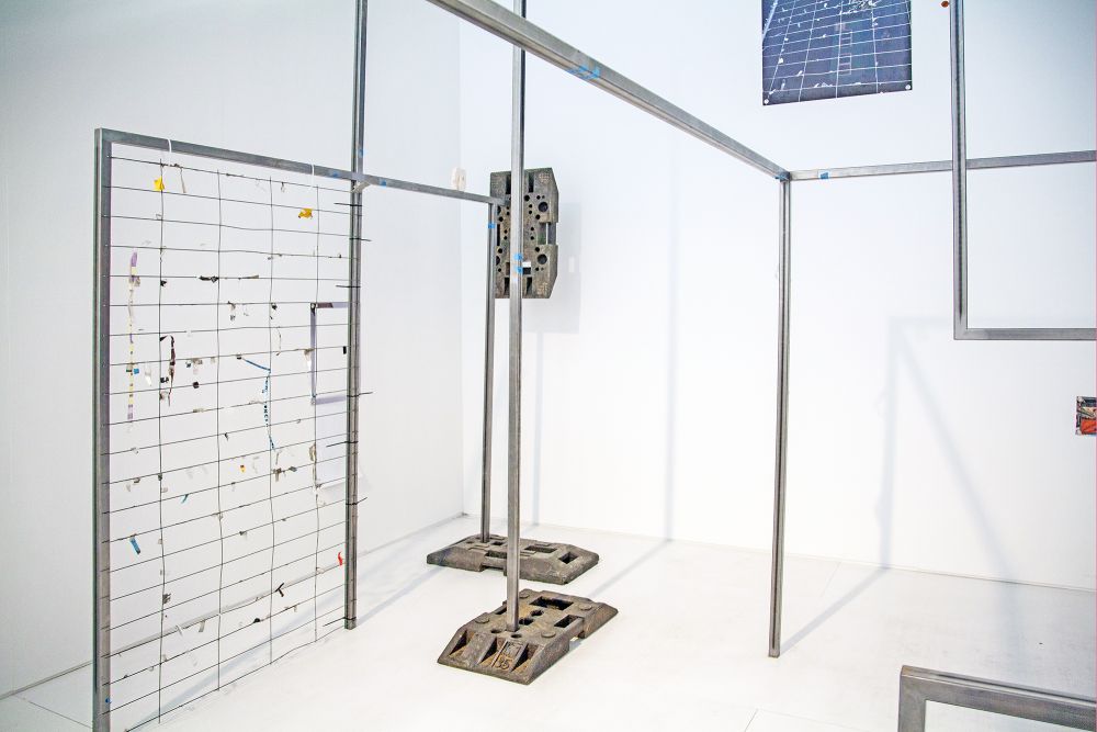 A slapstick pavilion made with typical temporary construction weights starts to resemble a figure. The metal structure that plugs into the weight system is used to mount and frame various artworks, found objects and videos.