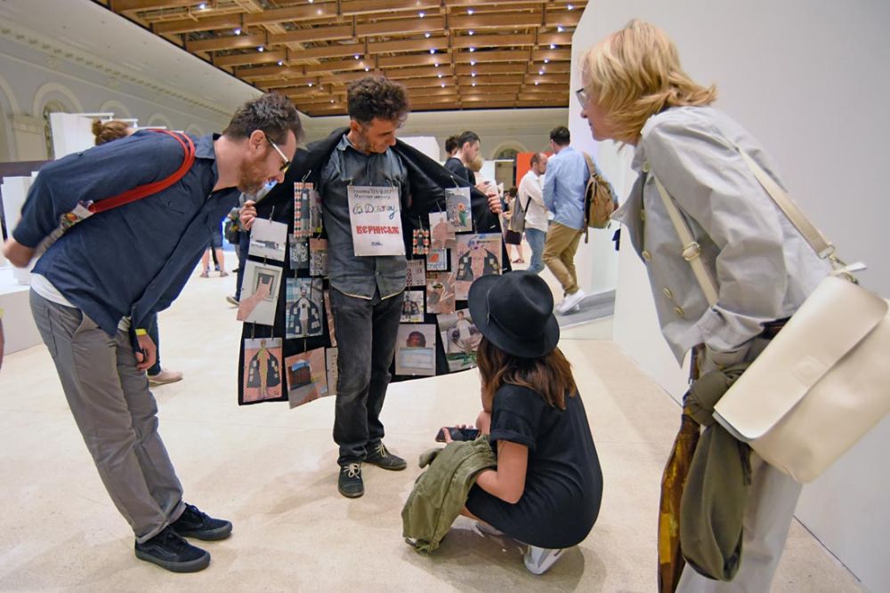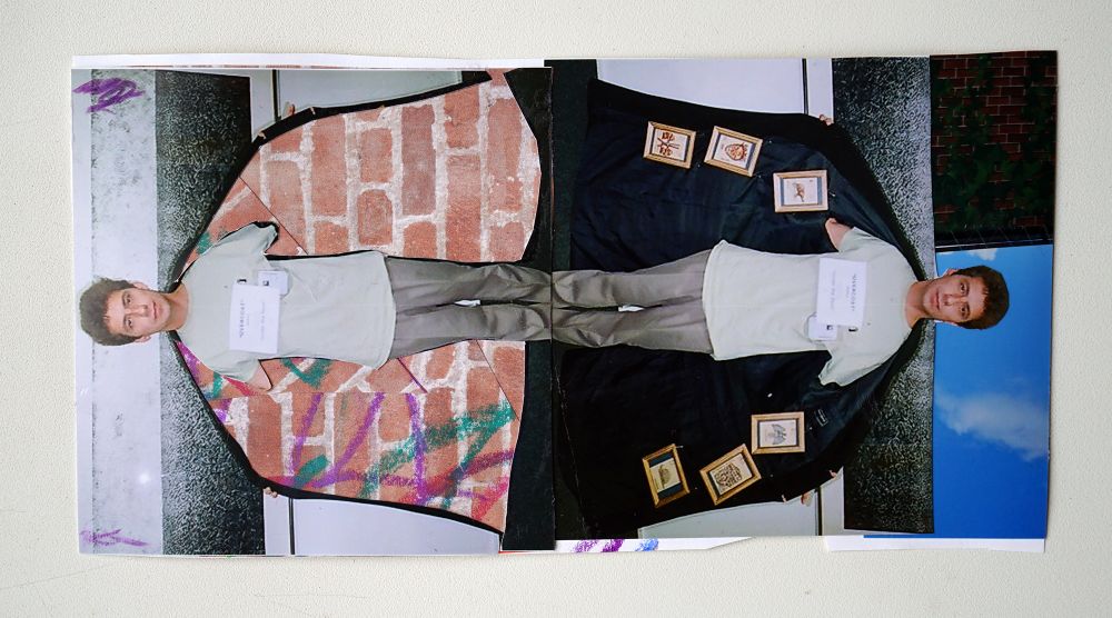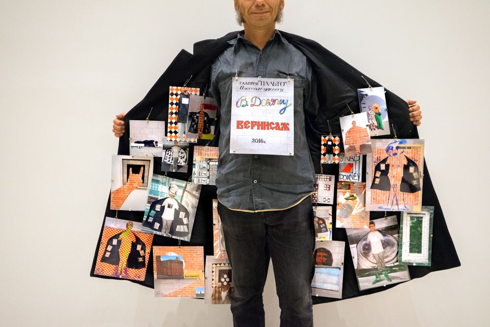 Since 1991 exhibitions are haunted by the performance artist Alexander Petrelli, who hails from Odessa (Ukraine) but lives in Moscow. He wears a long coat, which he opens conspiratorially to show artworks pinned to the lining of his "Gallery Overcoat." These works travel with him and again leave the exhibition space.
